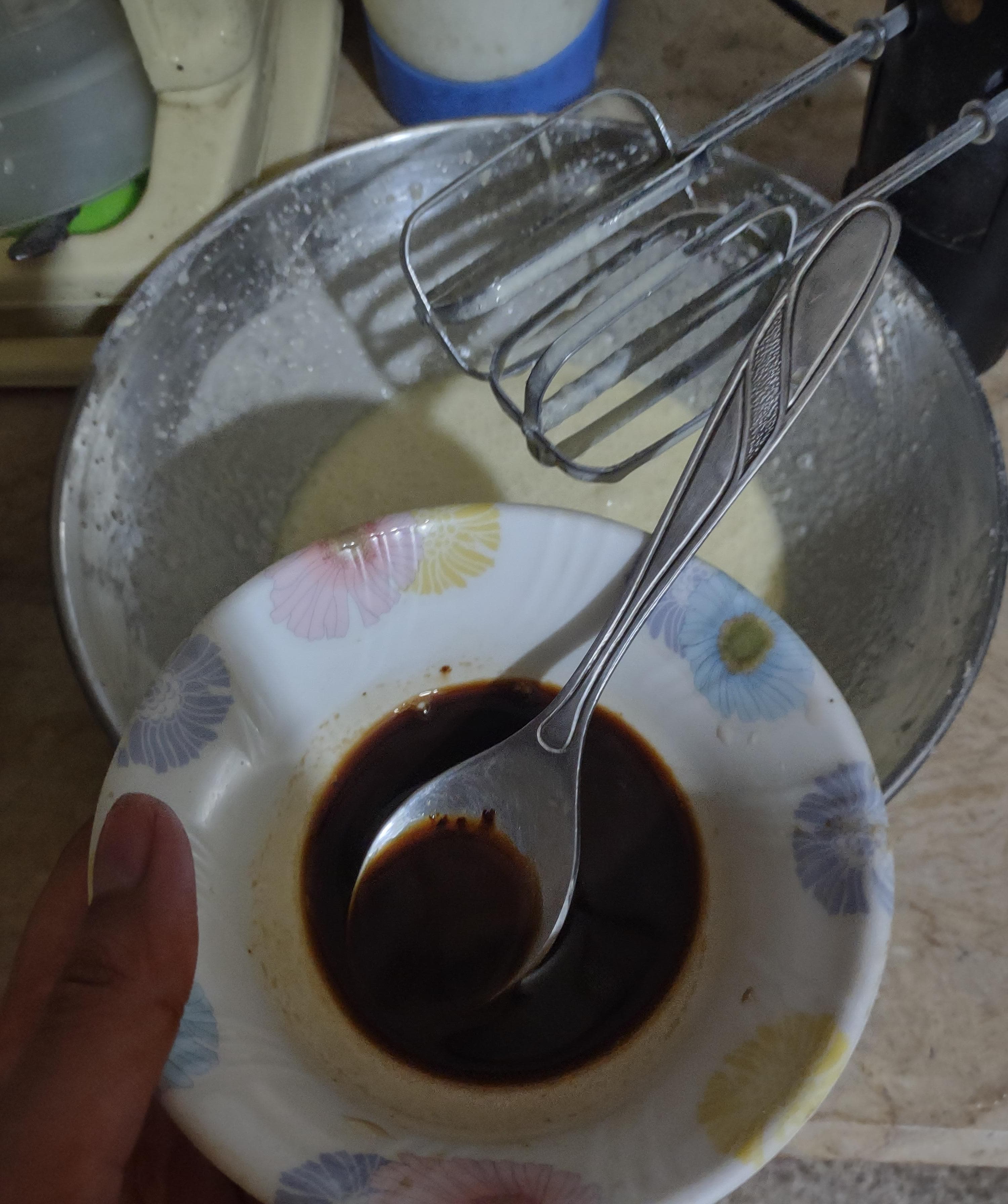 Then, when the three ingredients are mixed well, I dissolved coffee into water and added it to the mixture along with vanilla essence. My family loves the aroma and taste of coffee, so I add this to my cakes. This is completely optional. It totally depends on your taste buds. But on my recommendation, do give it a try, it enhances the flavor and makes it rich.