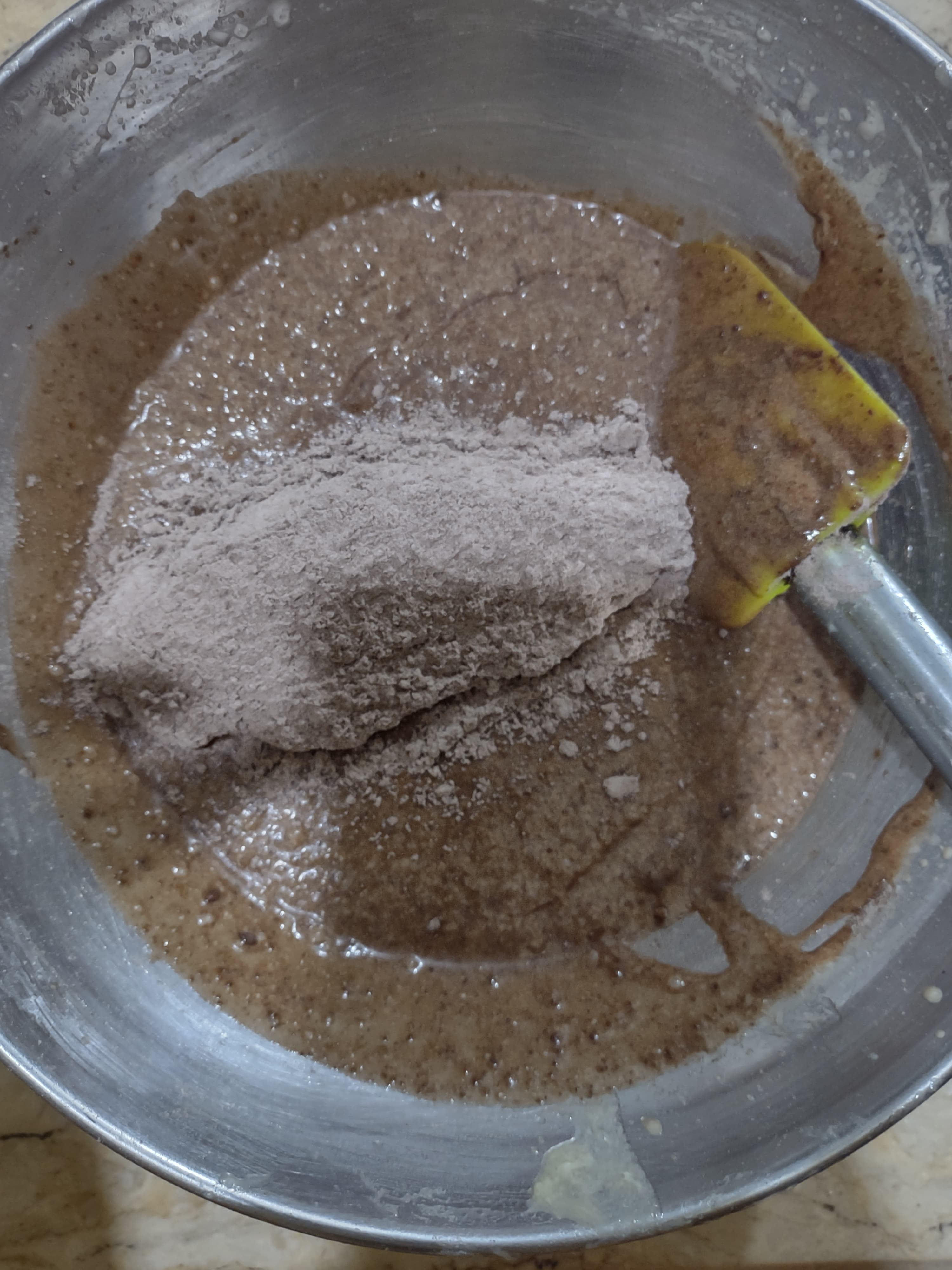 Now add the dry mixtures to your batter in chunks and fold them with the help of a spoon. I had my spatula, so I used it for folding. I personally love silicon spatula because it never keeps anything on it. Now when everything is mix well add the required amount of milk and fold it again.