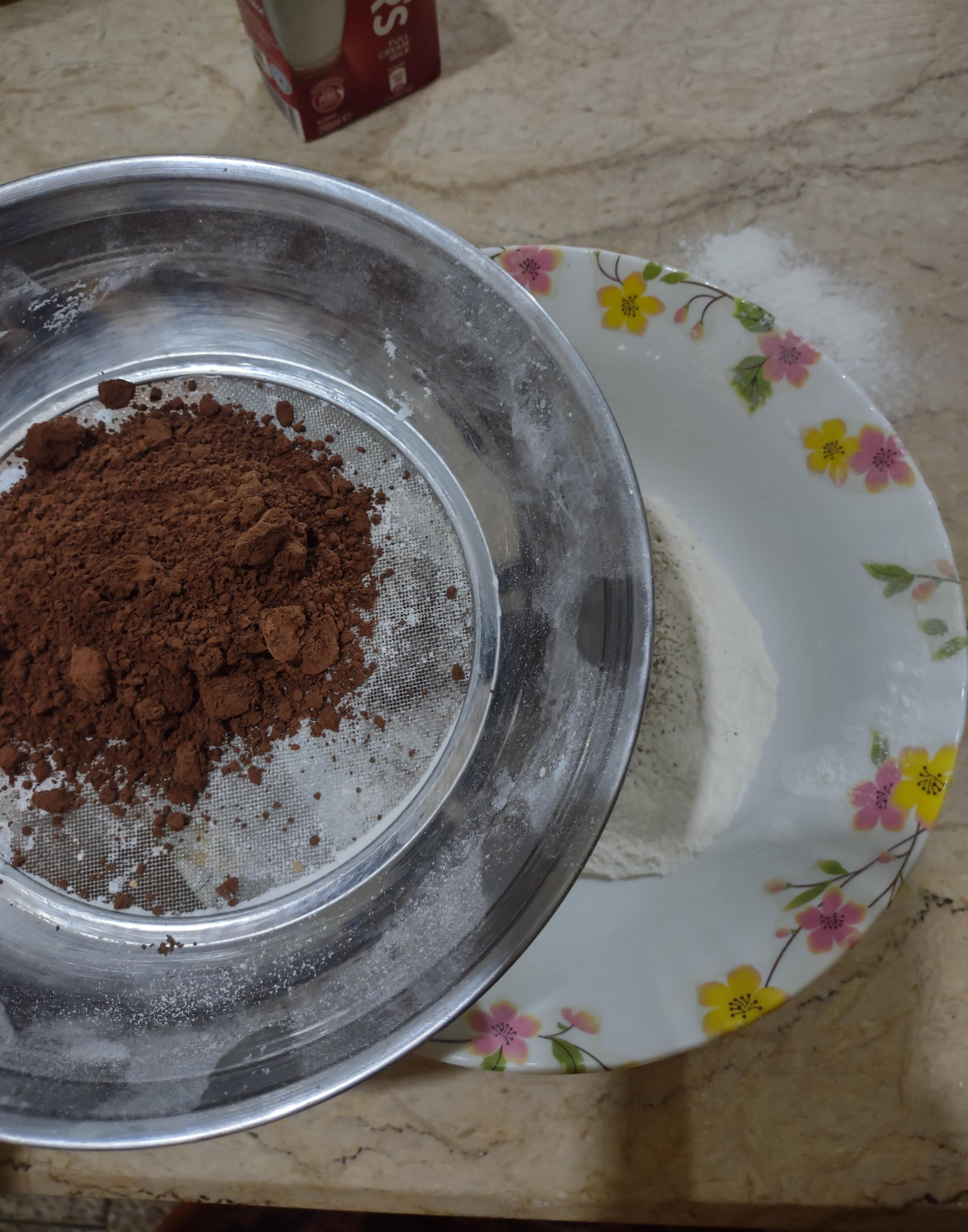 Now, I sift all my dry ingredients. That includes all-purpose flour, cocoa powder, and baking powder. Sifting is very important. Cocoa powder is the most dangerous ingredient for your cake. If it is not sifted thoroughly, it creates lumps in your mixture and does not make it smooth.
