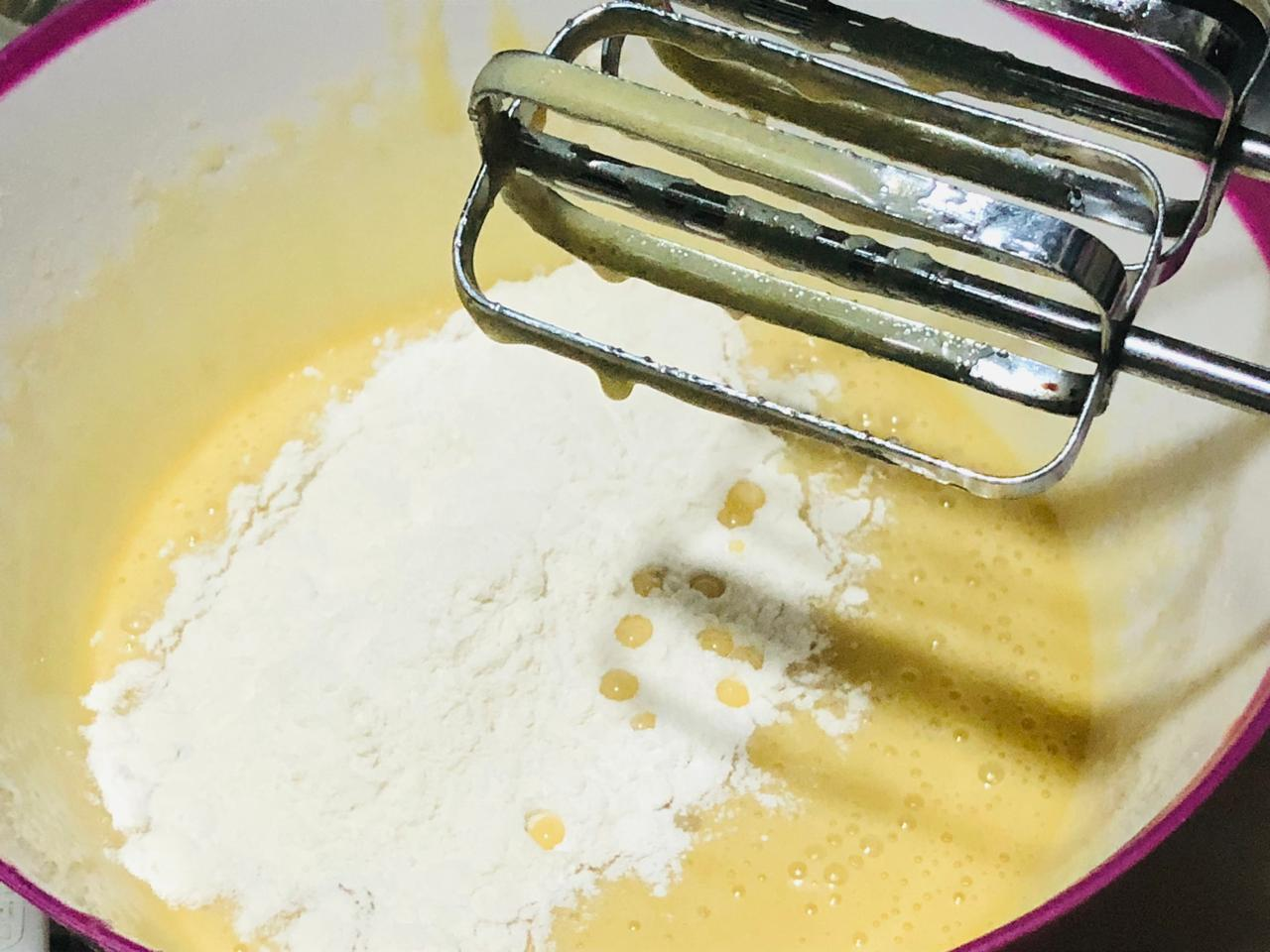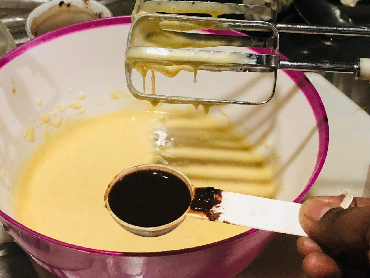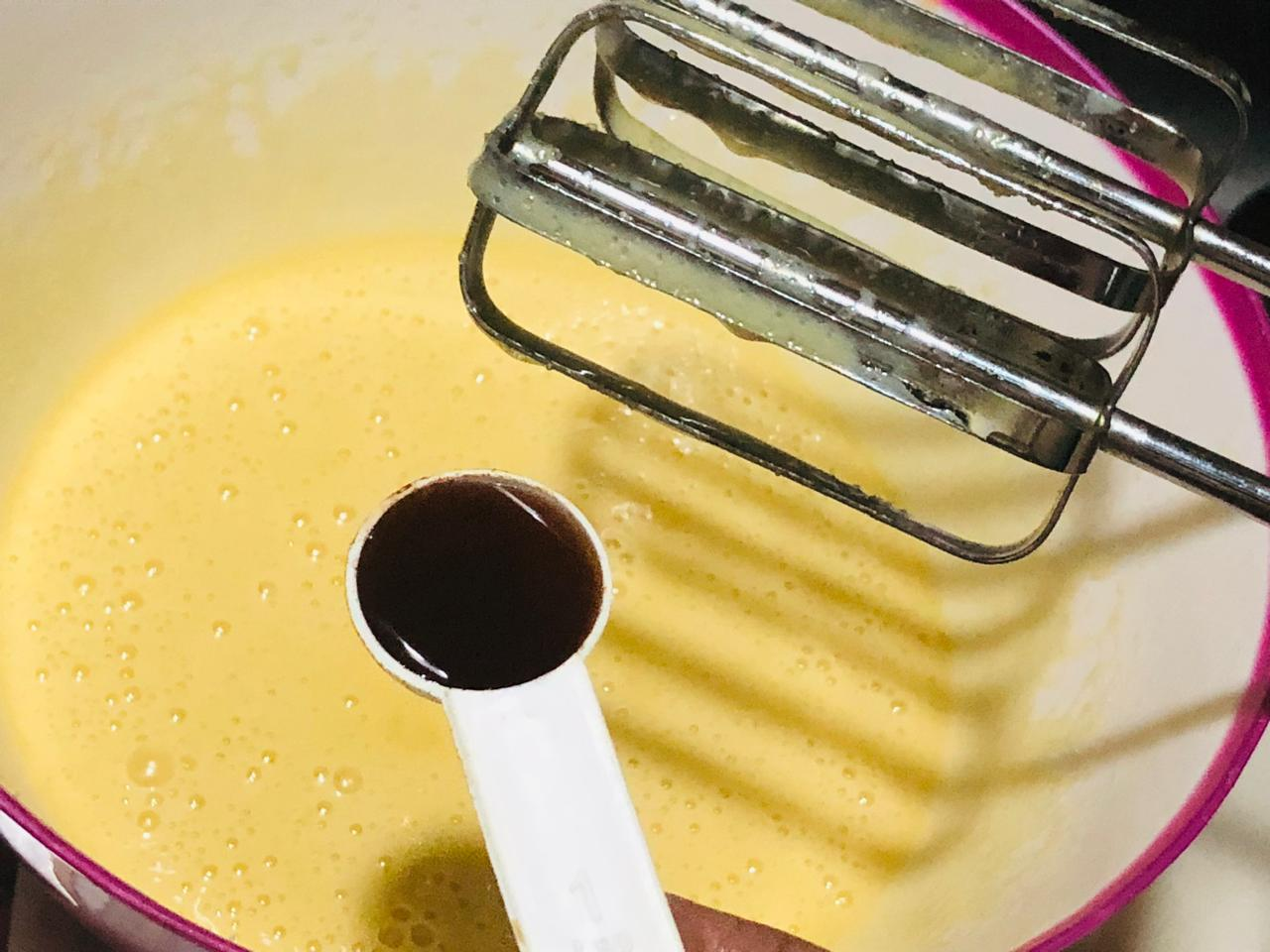 2.Put two eggs in this batter mixture and take a light bit for a minute then add a spoonful of vanilla to it and take a light bit again for a minute. At this stage after adding vanilla it will add an extra aroma and flavor. Bit for another minute with half a spoonful of baking powder.