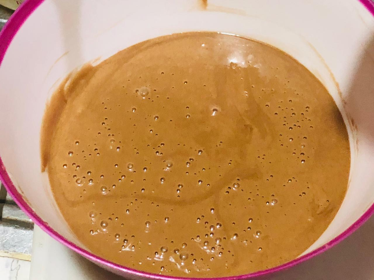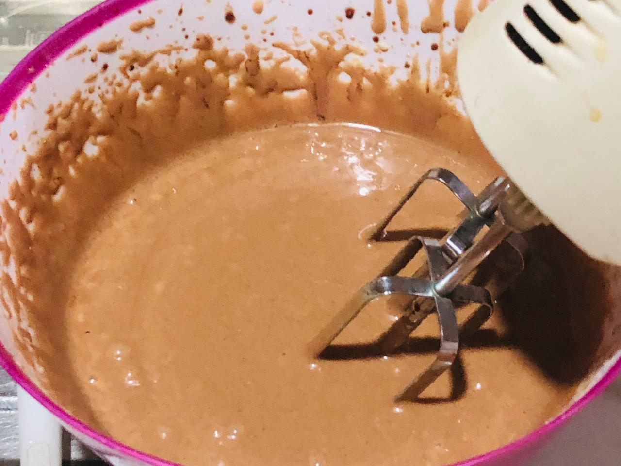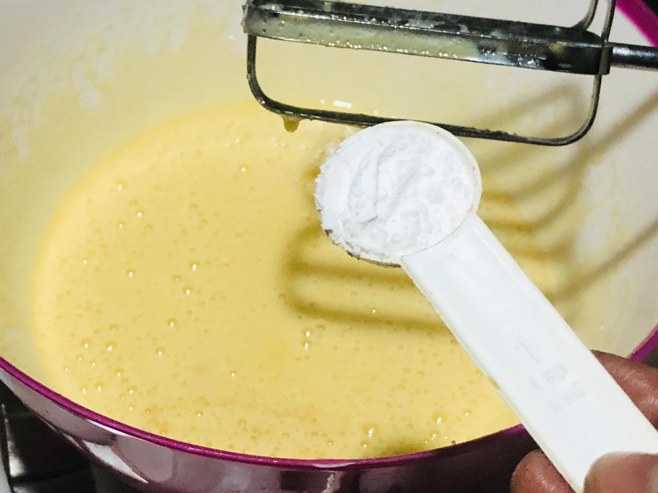 2.Put two eggs in this batter mixture and take a light bit for a minute then add a spoonful of vanilla to it and take a light bit again for a minute. At this stage after adding vanilla it will add an extra aroma and flavor. Bit for another minute with half a spoonful of baking powder.