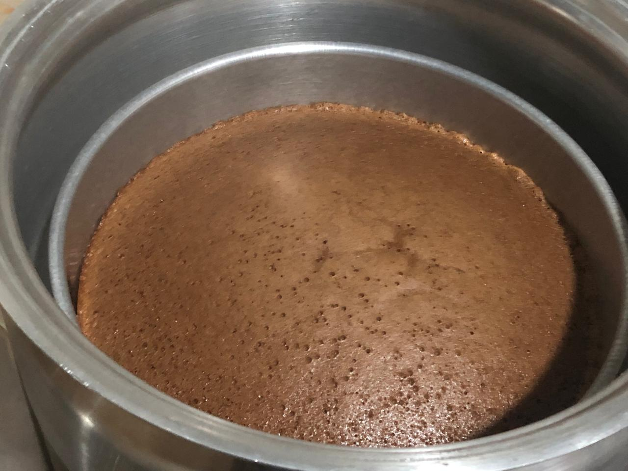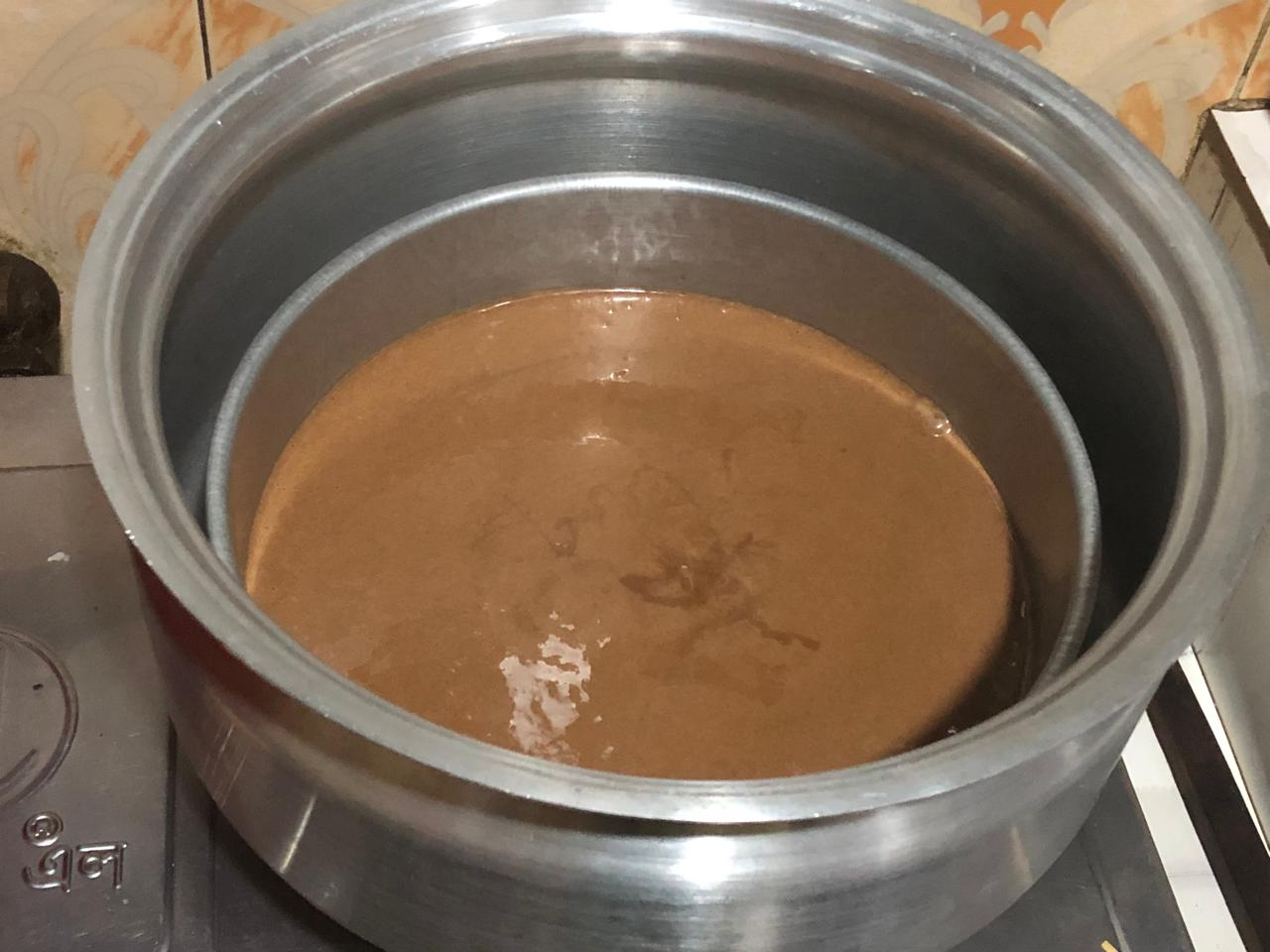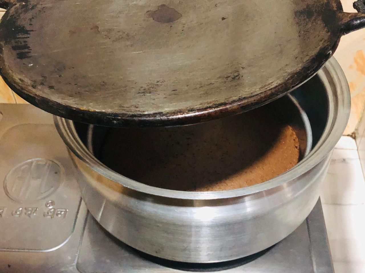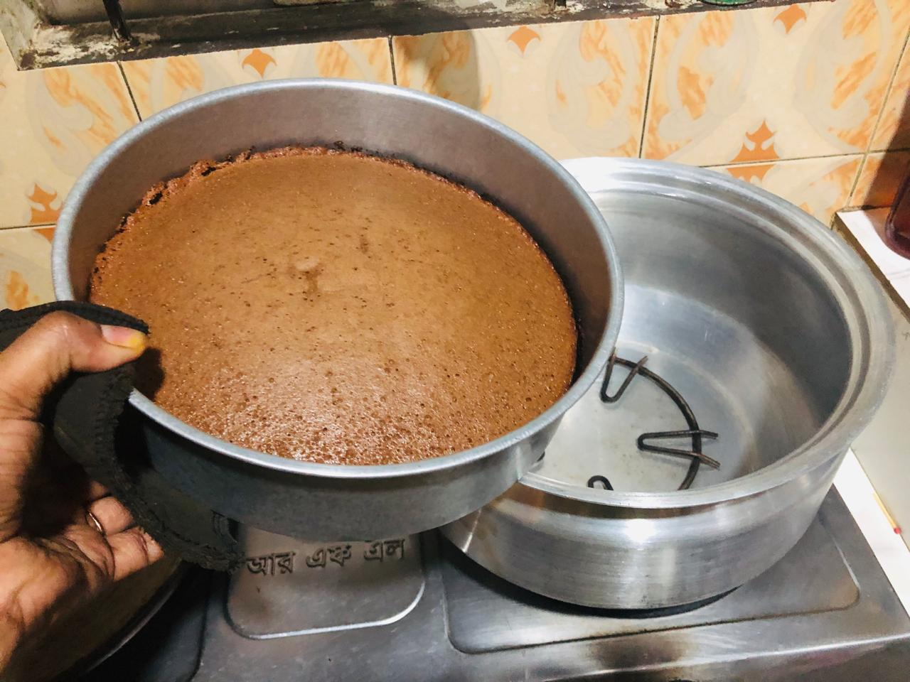 In this case I'm adopting my own technique. first stage I'll bake the cake for 30 minutes.In another gas stove I was left with a heavy steel pan. Exactly 30 minutes later I would lift the lid of the cake-making pot and cover it with this hot heavy pan. I'll cover it for exactly ten minutes because the top layer of the cake will bake very nicely in this hot heavy pan and the cake won't be raw on top.