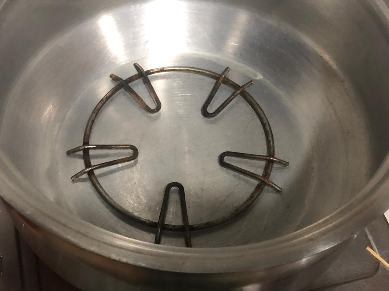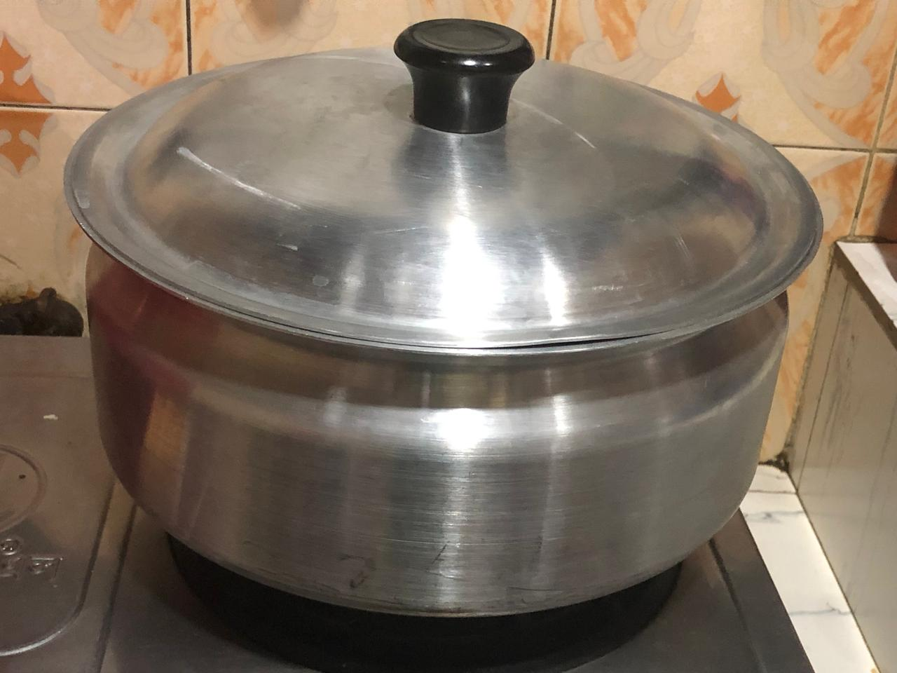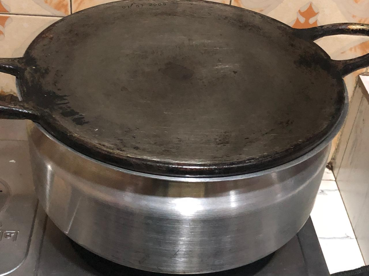 4.Today I'll bake this cake in a gas stove so at the beginning of making the cake I turned on the gas stove e and looked at an aluminum pan lid to keep the inner chamber of the aluminum pot warm.