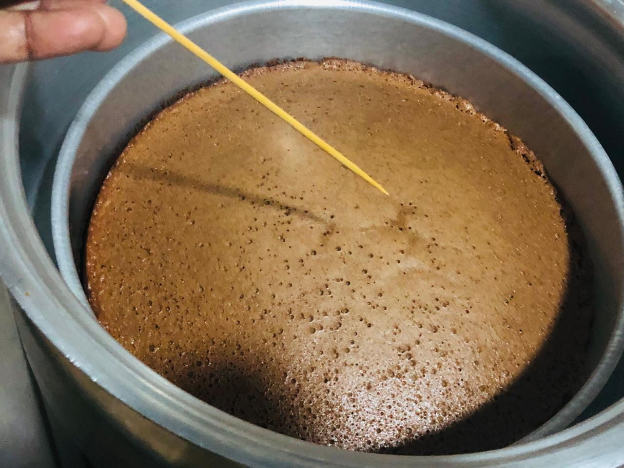 After 10 minutes when I lifted this heavy pan and checked the cake with a toothpick, today's cake looks like a cake made in an electric oven because the top was baked very well.