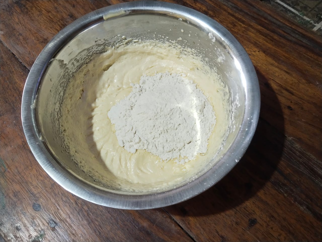 - Then let's prepare the flour mixture. So take a bowl and add flour to it. Then add baking powder to it and sift it well. Then add that flour mixture to the previously prepared batter and fold it.