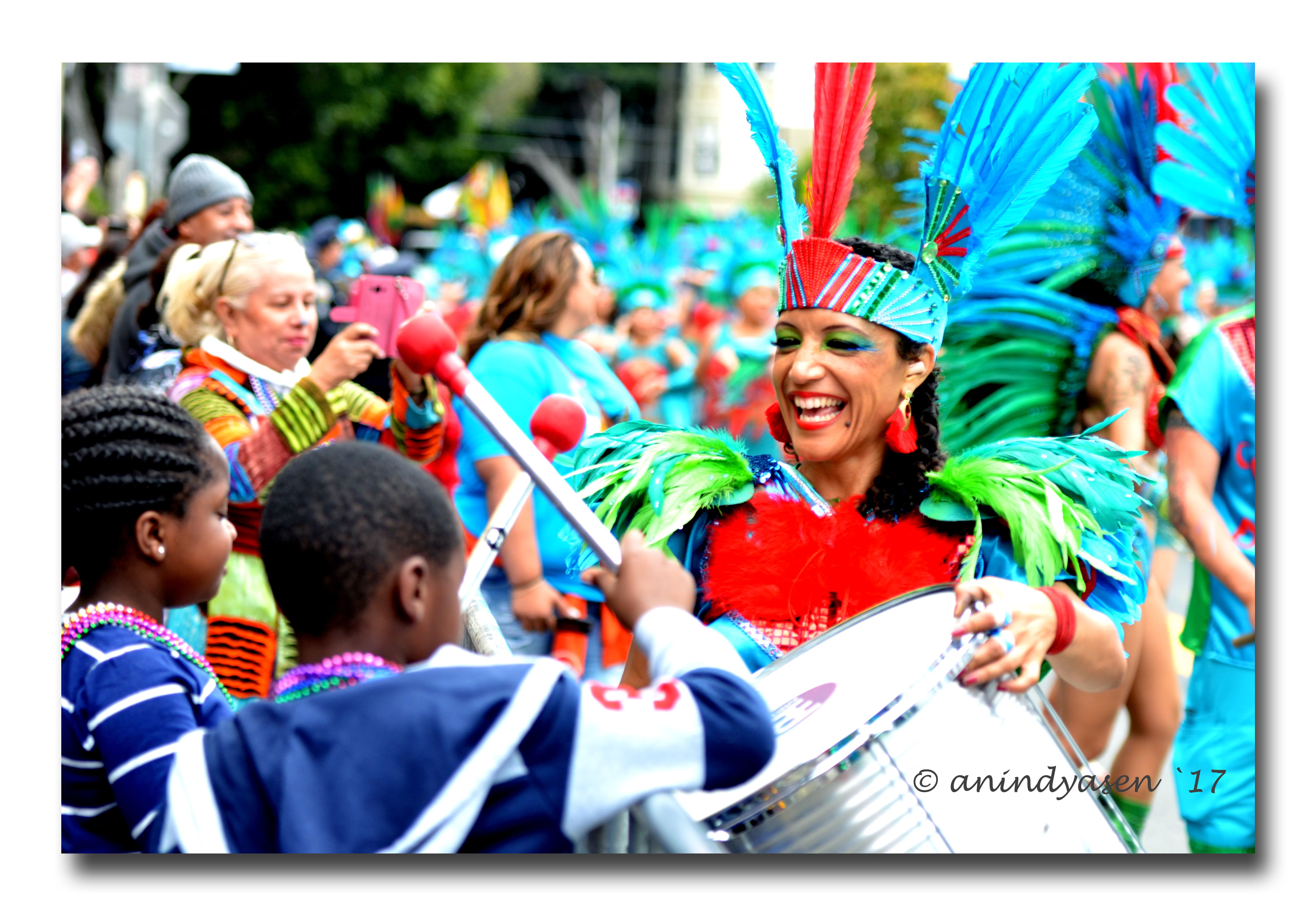 As the parade started the streets got crowded, children lined up in the front of the crowds and adults standing behind, eagerly waiting with their cameras on. Although there wasn’t much pushing and shoving, it was a little difficult to take good shots in the middle of a large cheering crowd. However, Anindya managed to capture the floats, costumes and some wonderful moments at the 39th Annual Carnaval San Francisco.