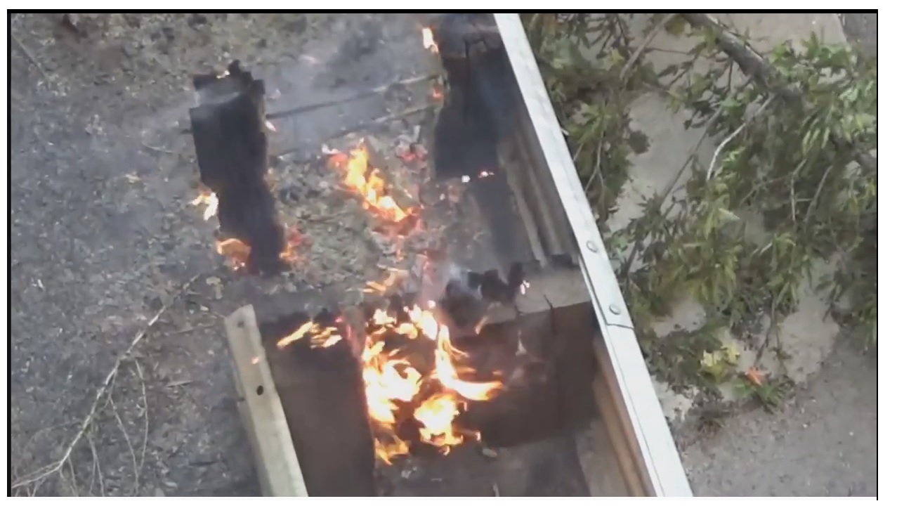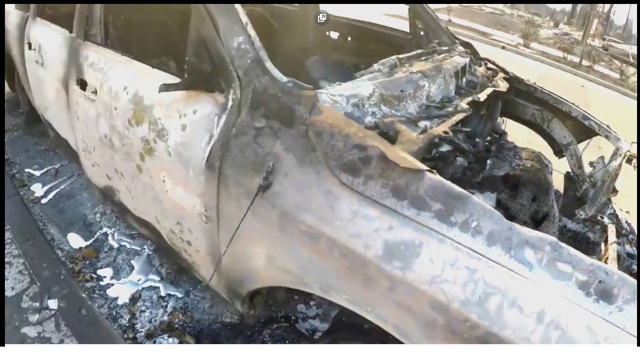 litt merkelig at bilen er helt utbrennt og ser du på asfalten så har varmen gått mot høyre, men den lille skogen til venstre for bilen er like grønn som før..
