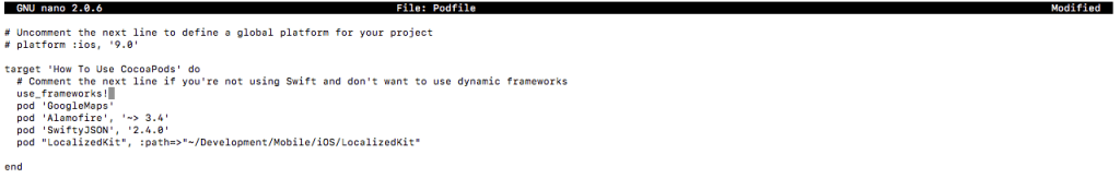 pod initដើម្បីបង្កើត Podfile ជាមួយនឹង Default Configuration រួចជាស្រេច - បើក Podfile ដែលយើងទើបតែបានបង្កើតដោយប្រើប្រាស់ command nano, vim ឬ text editor ផ្សេងៗ