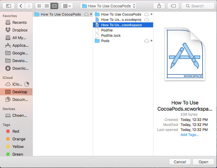 - បន្ទាប់ពីតម្លើង dependencies រួចរាល់ហើយ អ្នកត្រូវបើក Project របស់អ្នក ដោយរើសយក Xcode workspace (.xcworkspace) ជំនួសឲ្យ Xcode project (.xcproject)