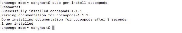 បើក Terminal រួច វាយ command: sudo gem install cocoapods រួចហើយវាយបញ្ចូលពាក្យសម្ងាត់កុំព្យូទ័ររបស់អ្នក