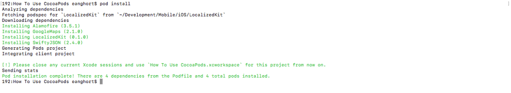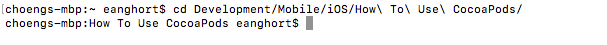 ឧទាហរណ៏៖ How To Use CocoaPods រួចហើយ បិទ project ដែលអ្នកទើបតែបានបង្កើត - បើក Terminal រួចចូលទៅកាន់ទីតាំង project របស់អ្នក ដោយវាយ command: