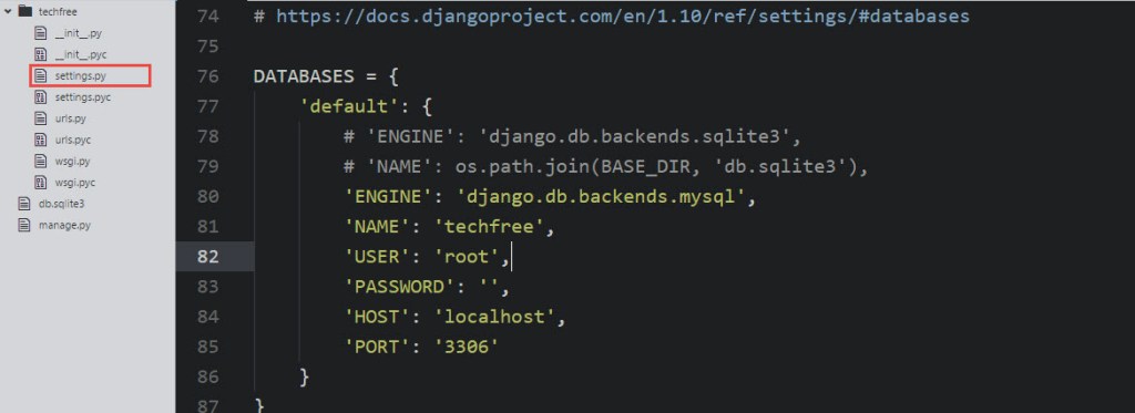 សូមបើកកូដរបស់អ្នកបន្ទាប់មកធ្វើការកែរប្រែនៅ File “settings.py” ដែលអ្នកបានឃើញកូដខាងលើនេះ។ នៅបន្ទាត់ 78, 79 ដែល TECHFREE បានបិតមិនអោយដំណើរការនោះ គឺជាកូដដែលតភ្ជាប់ជាមួយ MySQLite Database។ ដូច្នោះអ្នកត្រូវសរសេរកូដដើម្បីតភ្ជាប់ ជាមួយ MySQL database ដូចខាងលើនេះ។