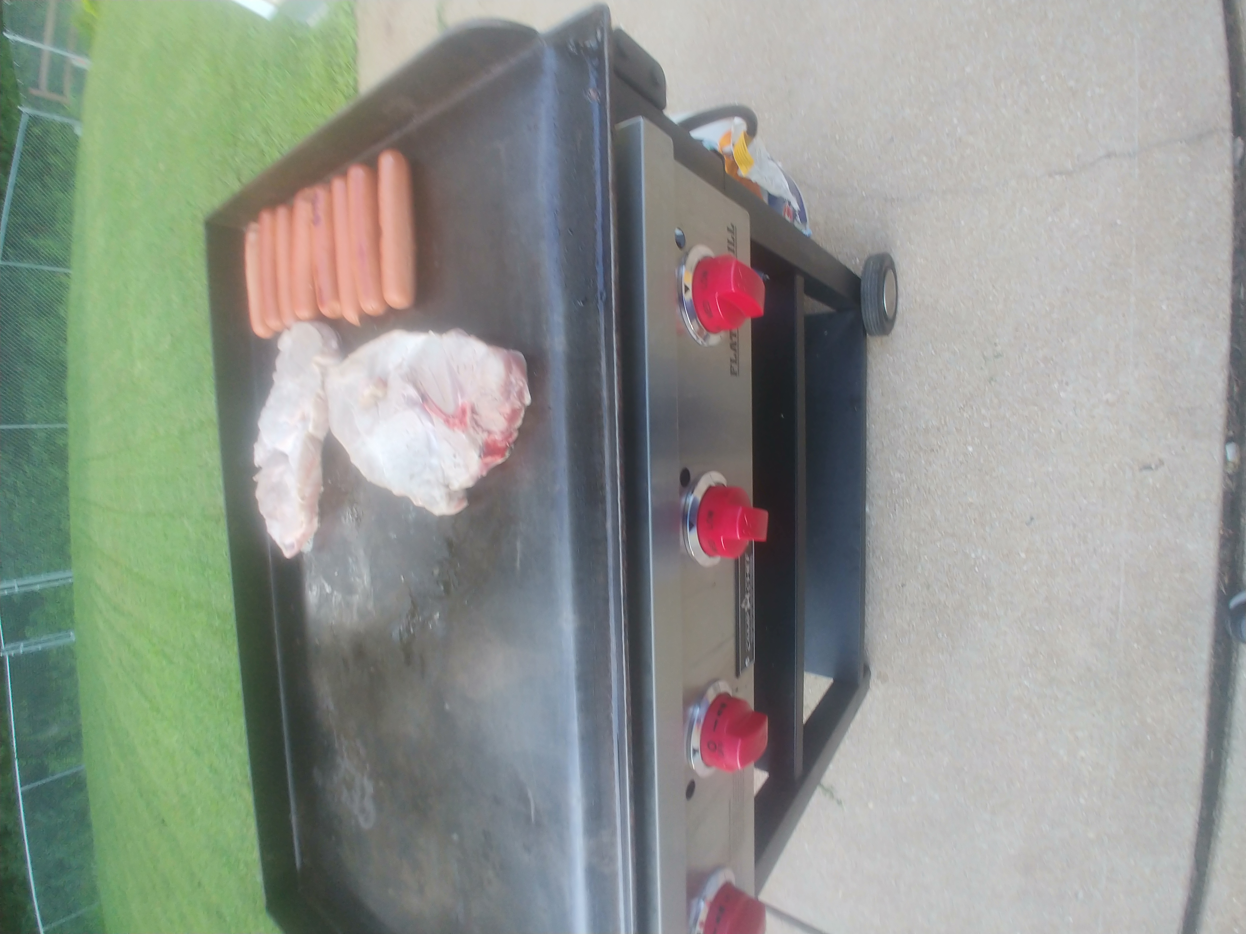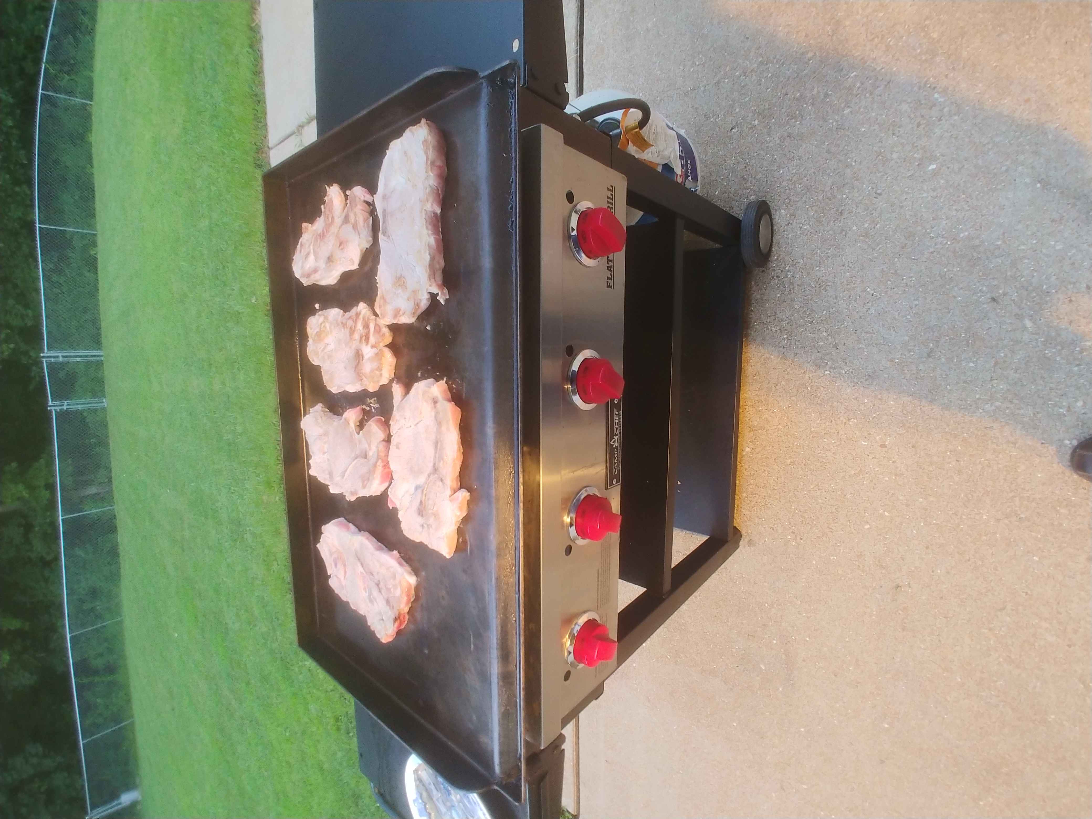 The Camp Chef griddle is just that with a removable flat top and regular grill underneath. It's ideal for cooking pretty much anything on. Since there's ample room pork steaks are easy to place and turn. I've done sirloins on it, also, and those have turned out just as well. One trick with those is to use some Weber, Chicago Steak seasoning which really adds flavor. The raised sides and back make it convenient to press with hot dogs and bratwursts to cook all sides evenly. Overall, a great, versatile, griddle and grill.