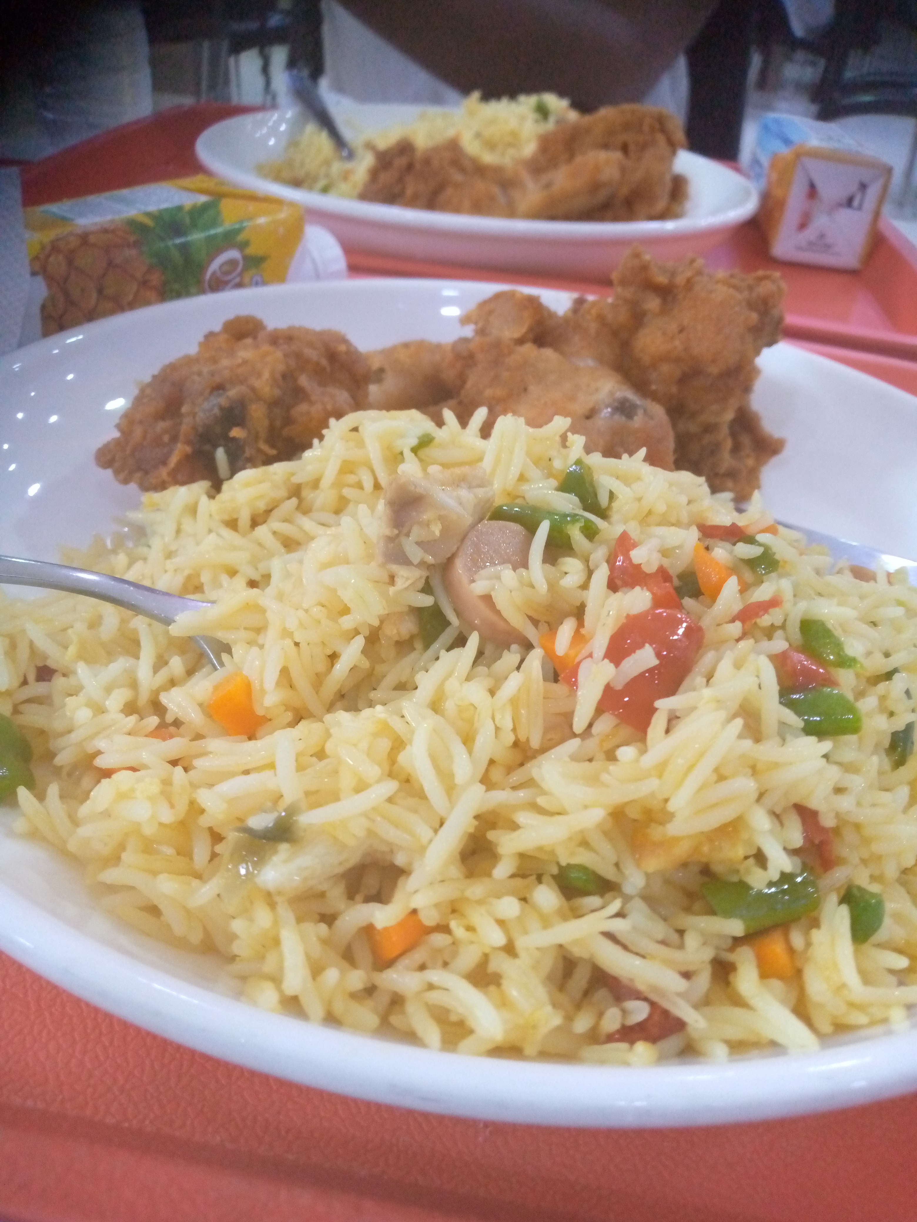 We both ordered Chinese fried rice with chicken and five alive pulpy drinks while efe ordered just a bottle of soft drink.
