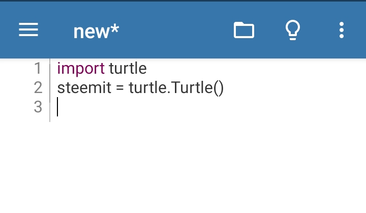 For the second line, I am giving turtle a function, so I can say let Steemit be the turtle. In coding, I will say "steemit = turtle.Turtle()" after that I click enter to proceed to line 3.