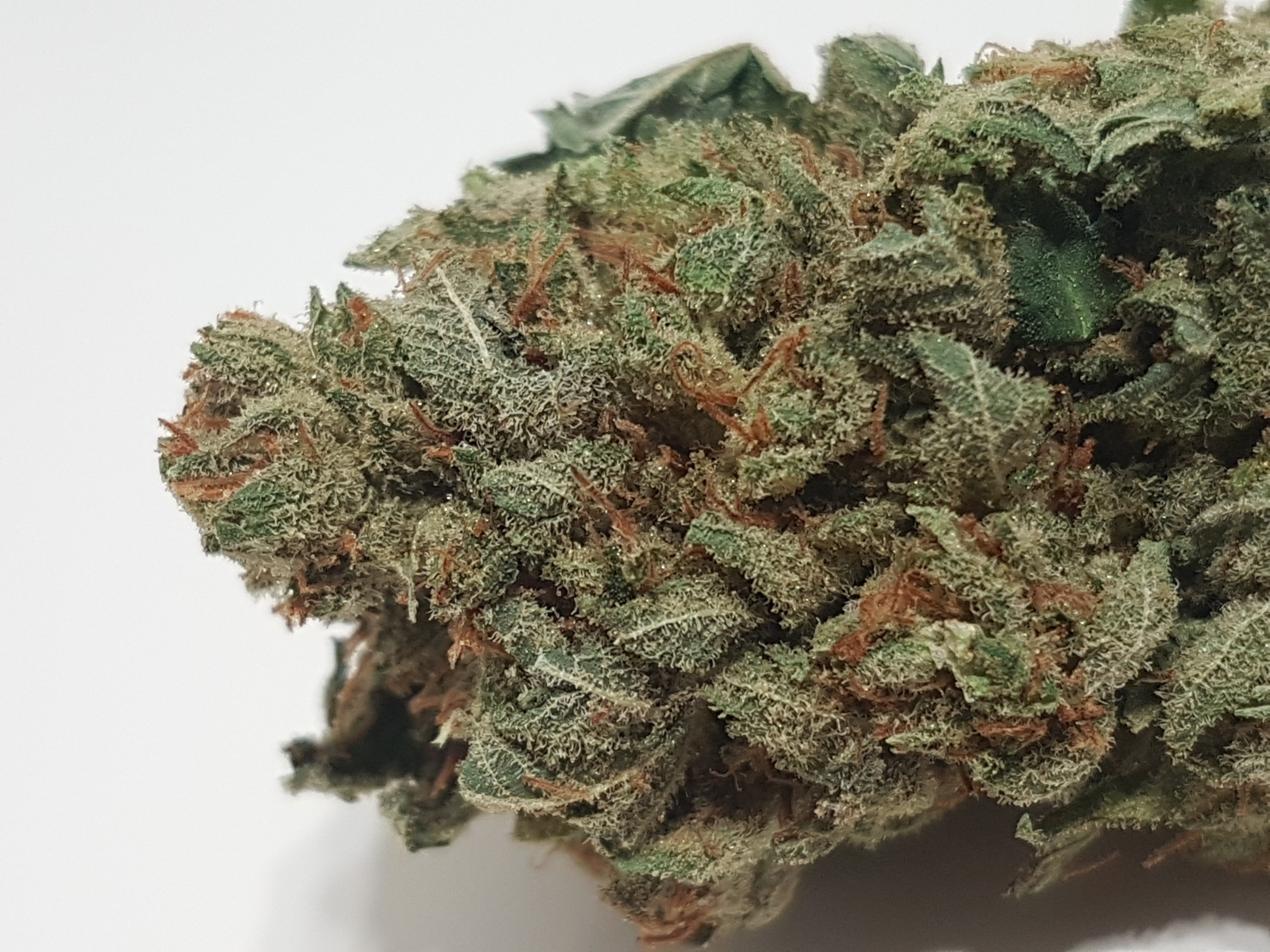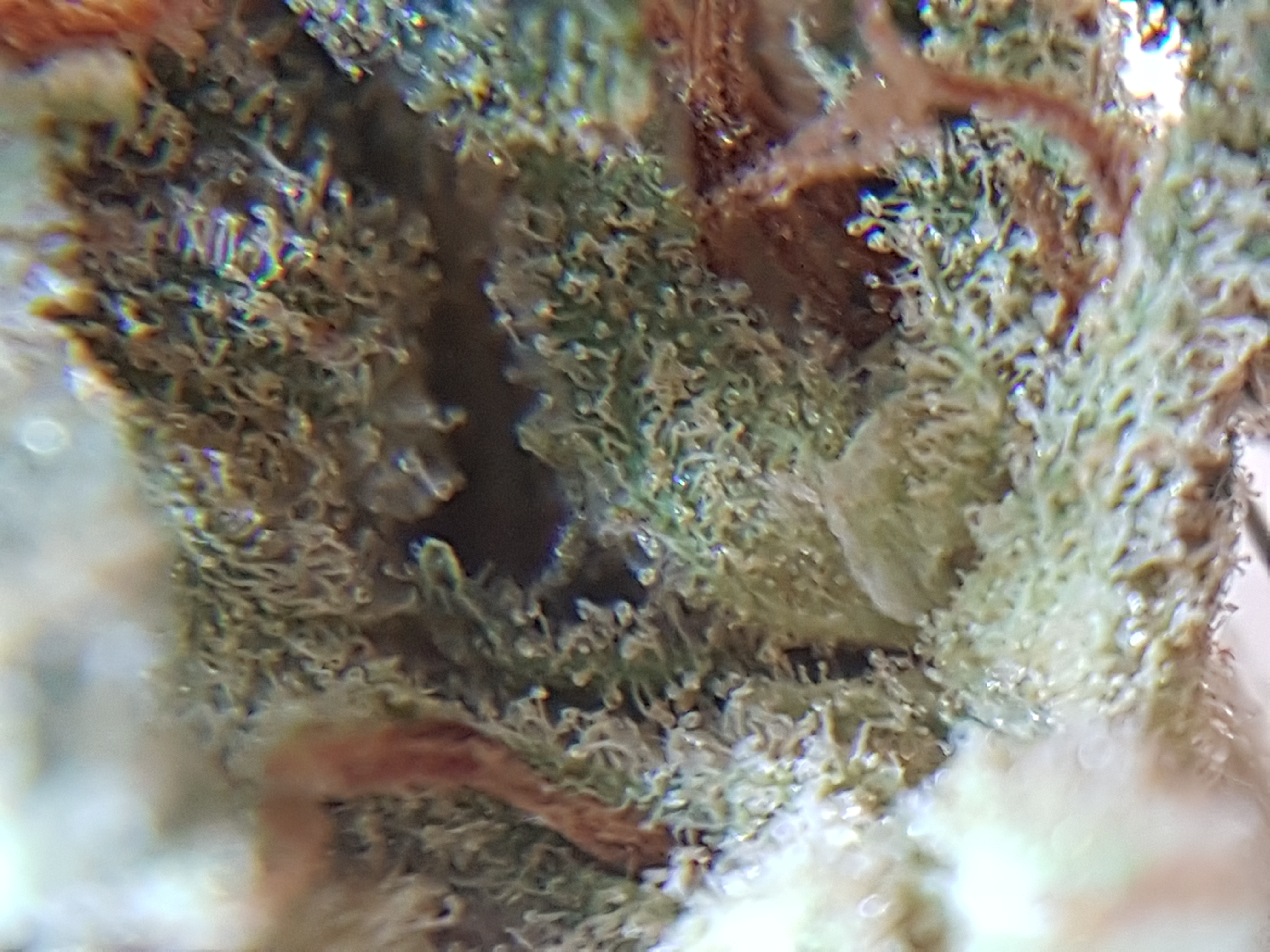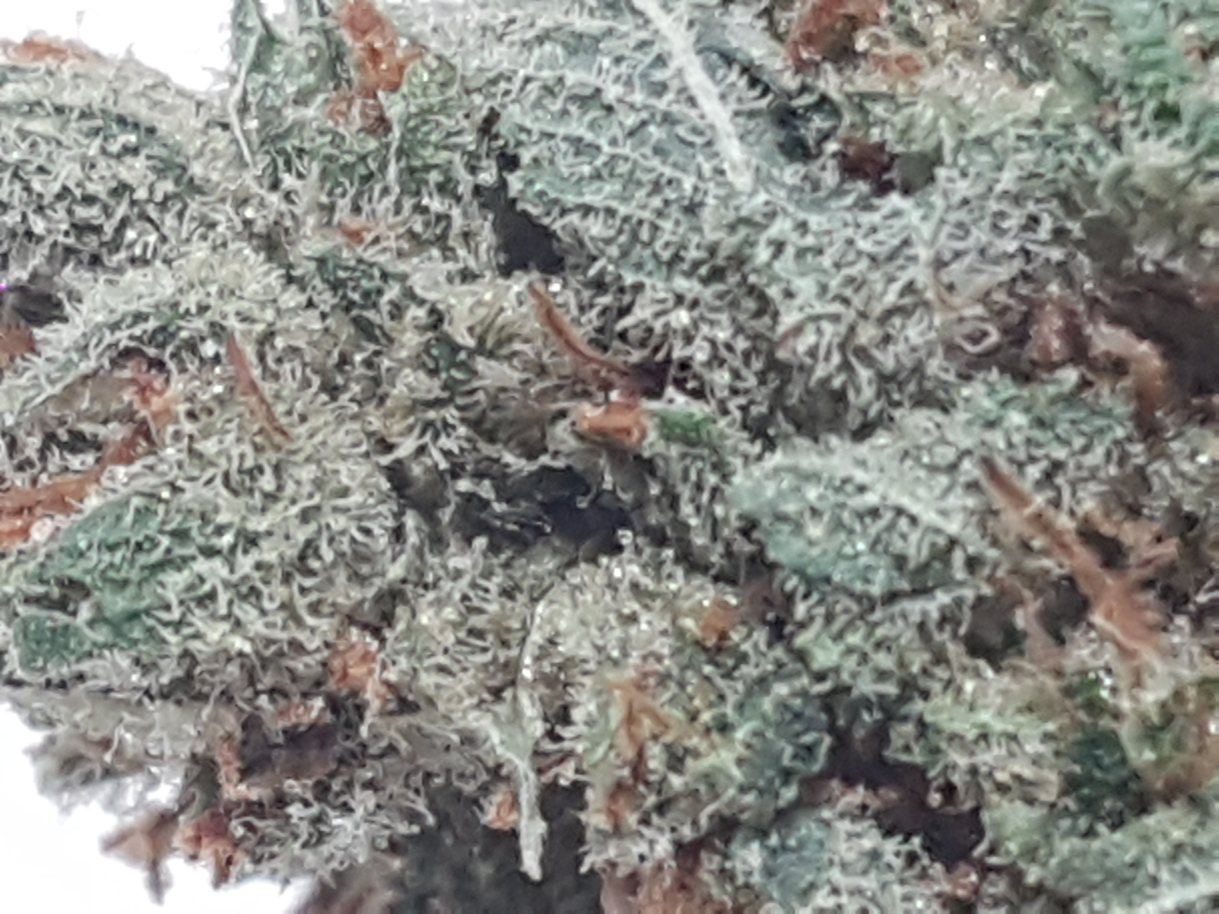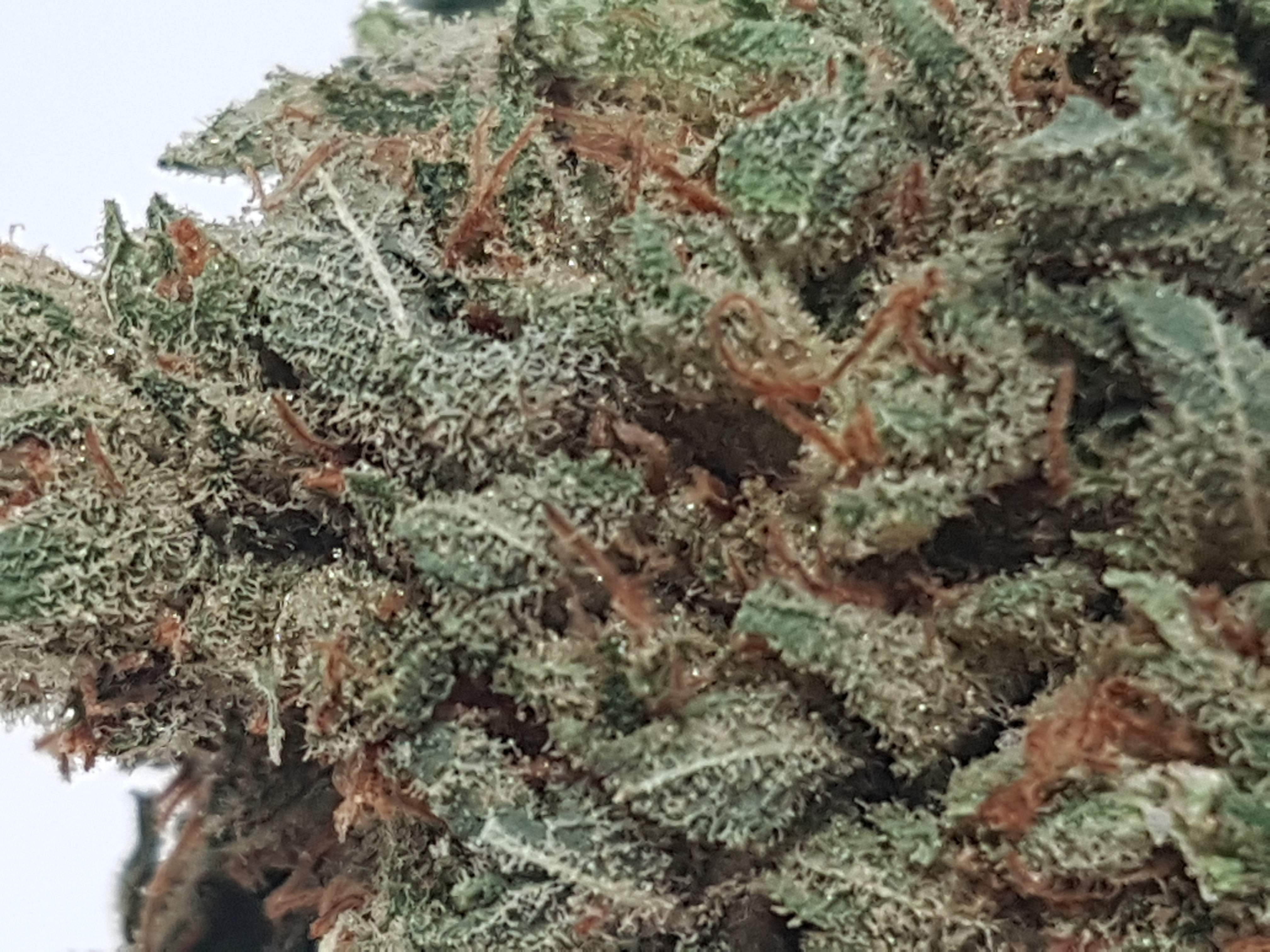 The appearance is a little bit leafy and under trimmed at first glance. Medium to light green in color accompanied by an abundance of smaller orange pistols and once you get past the extra leaves it has a nice covering of trichomes. Speaking of trichomes we have a nice array of trichomes from clear to milky to amber. Most of what i see through the scope is clear and milky with the odd amber trichome popping out.