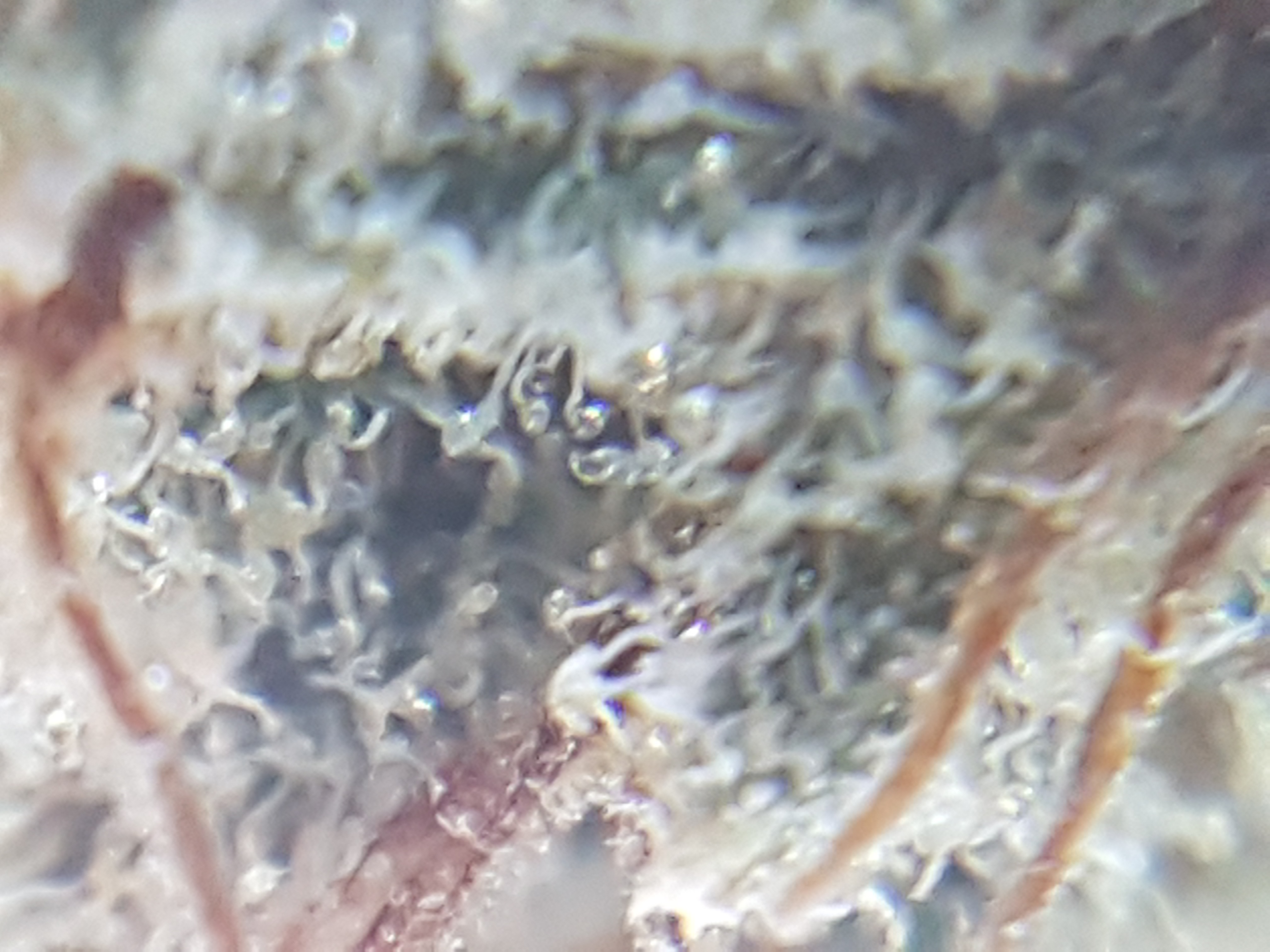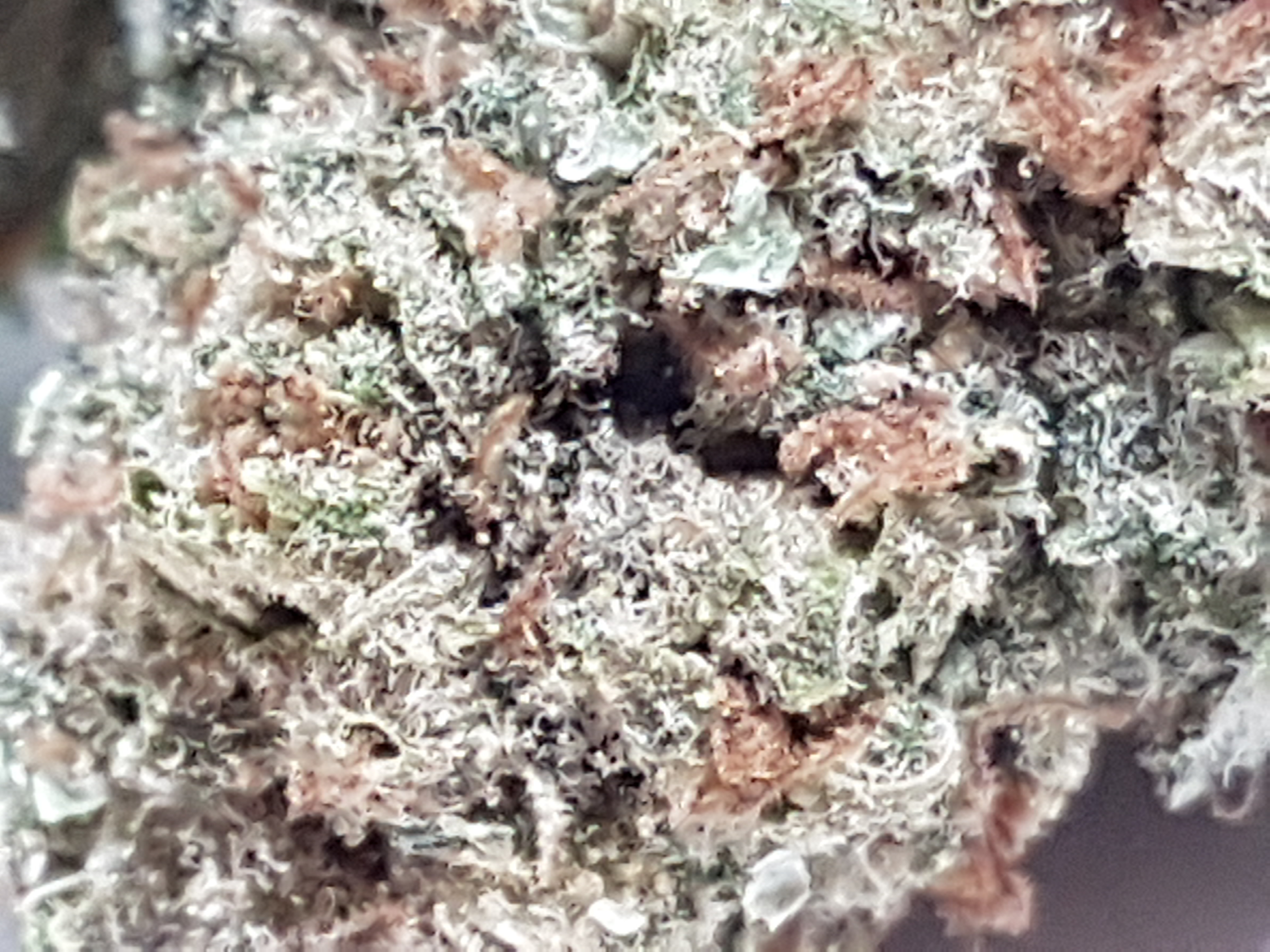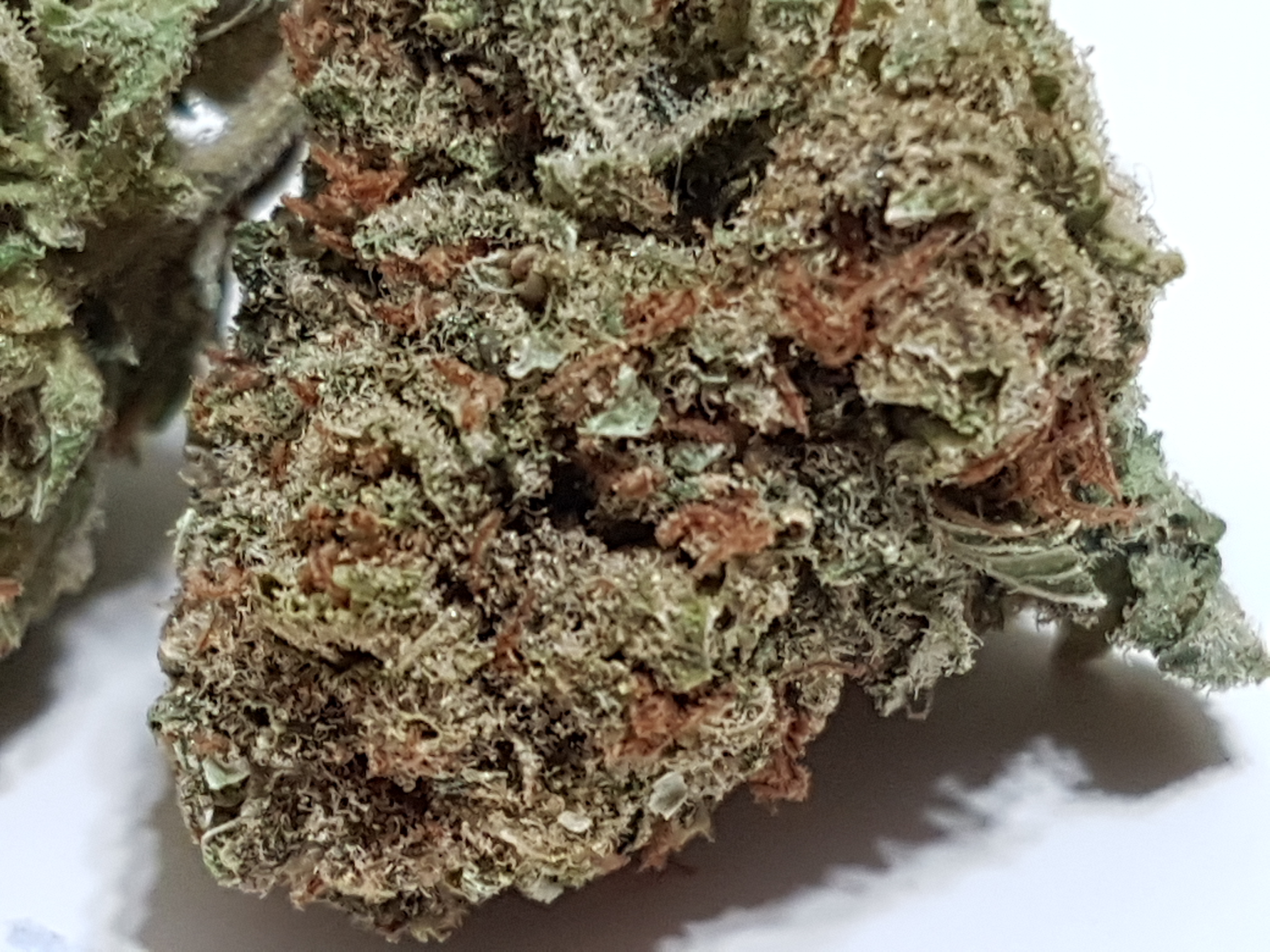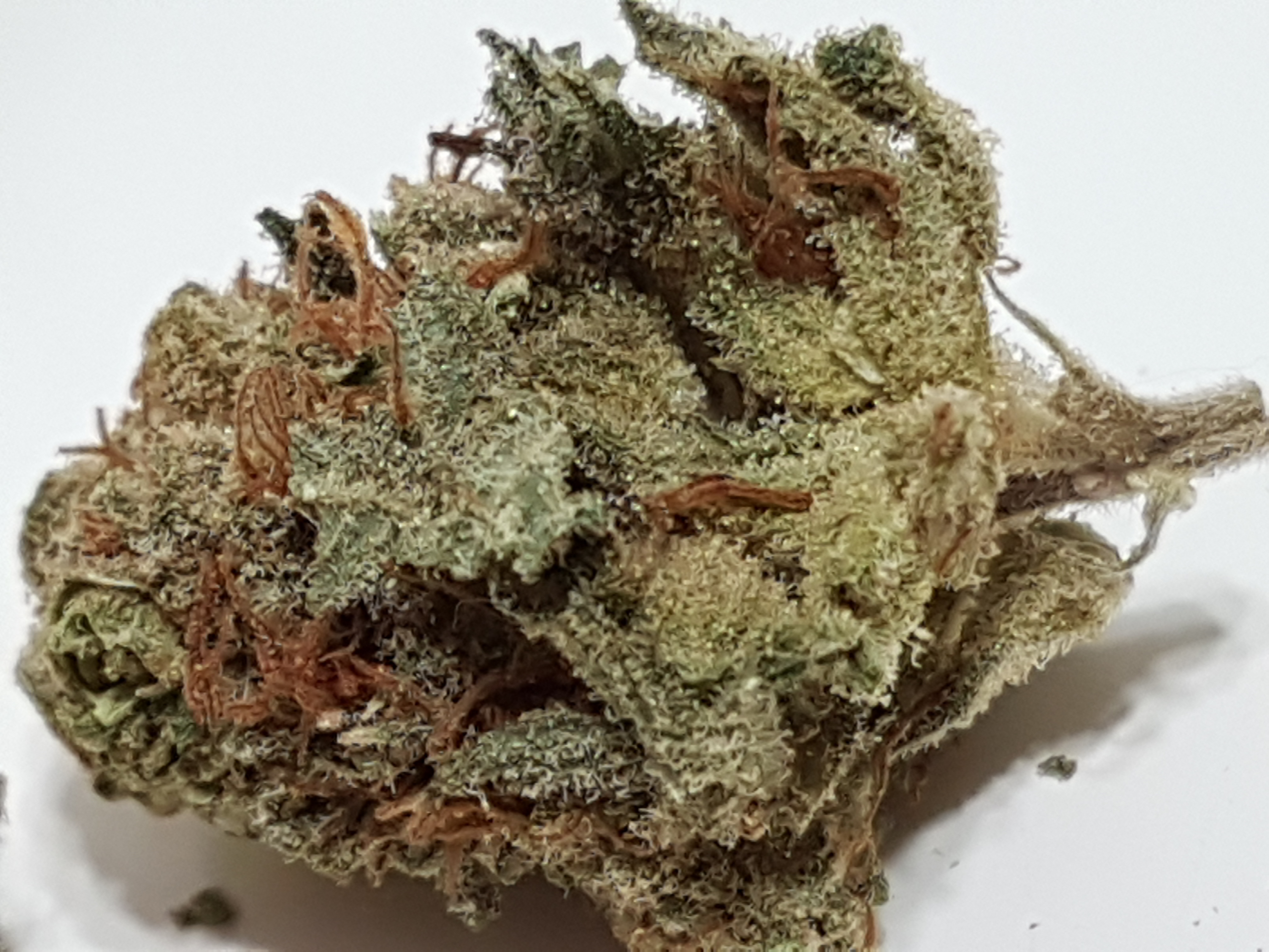 The appearance is a little bit leafy and under trimmed at first glance. Medium to light green in color accompanied by an abundance of smaller orange pistols and once you get past the extra leaves it has a nice covering of trichomes. Speaking of trichomes we have a nice array of trichomes from clear to milky to amber. Most of what i see through the scope is clear and milky with the odd amber trichome popping out.