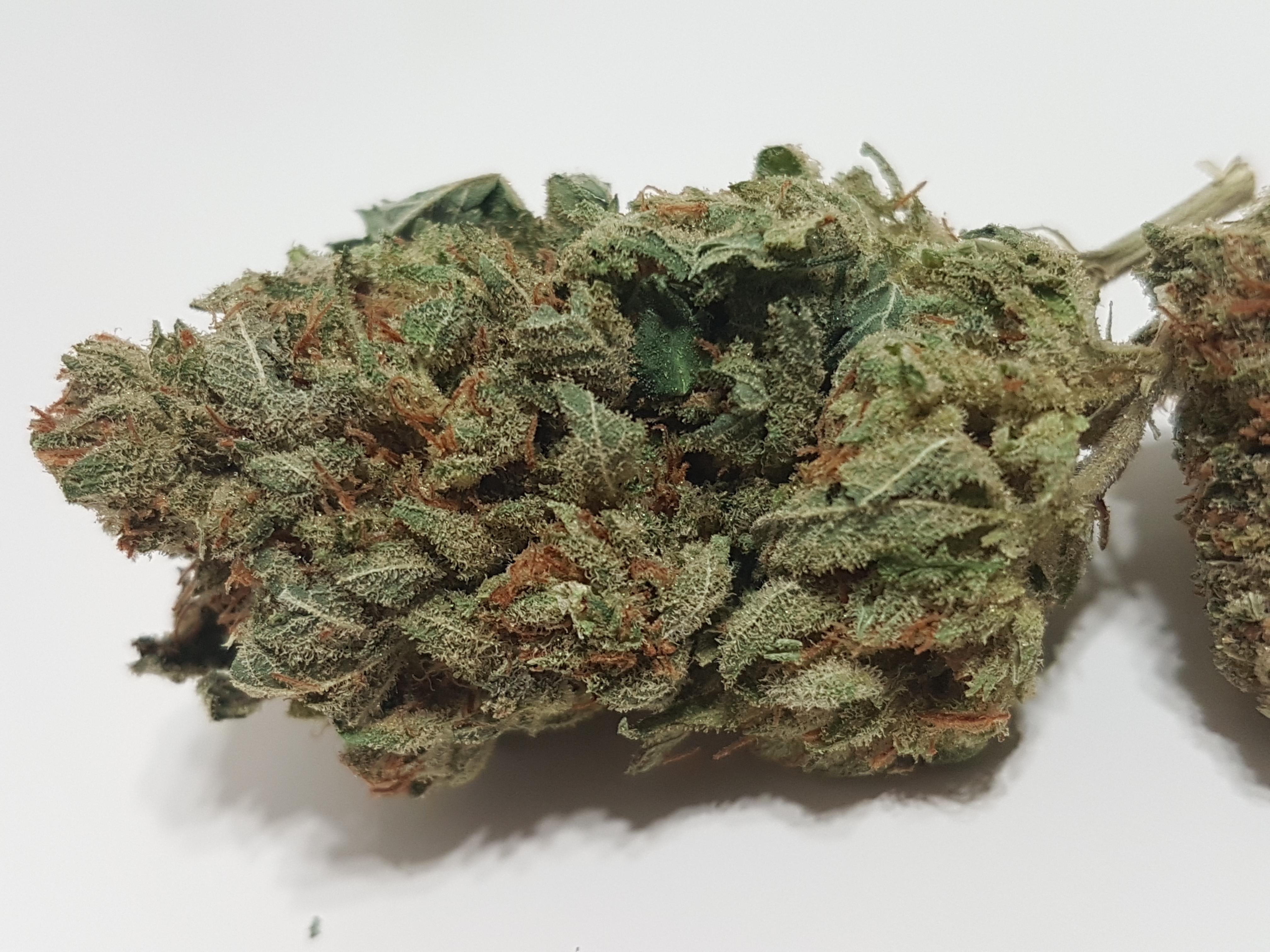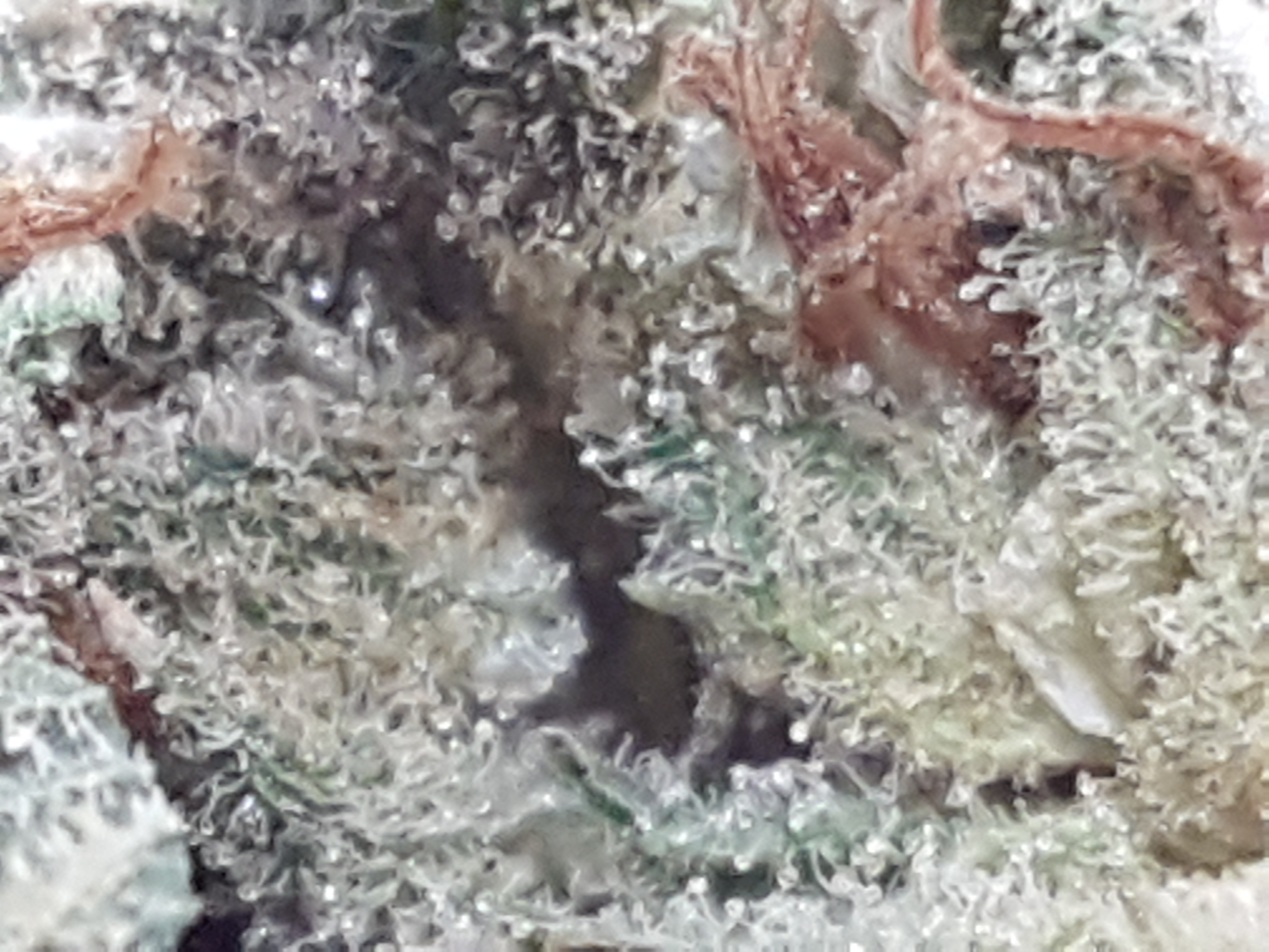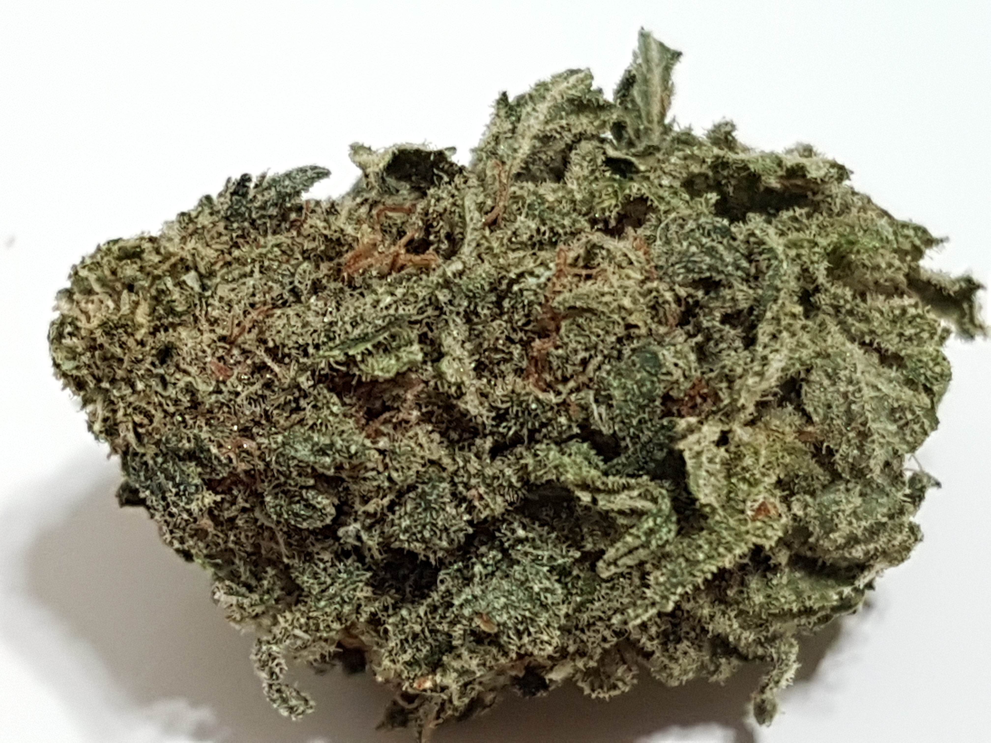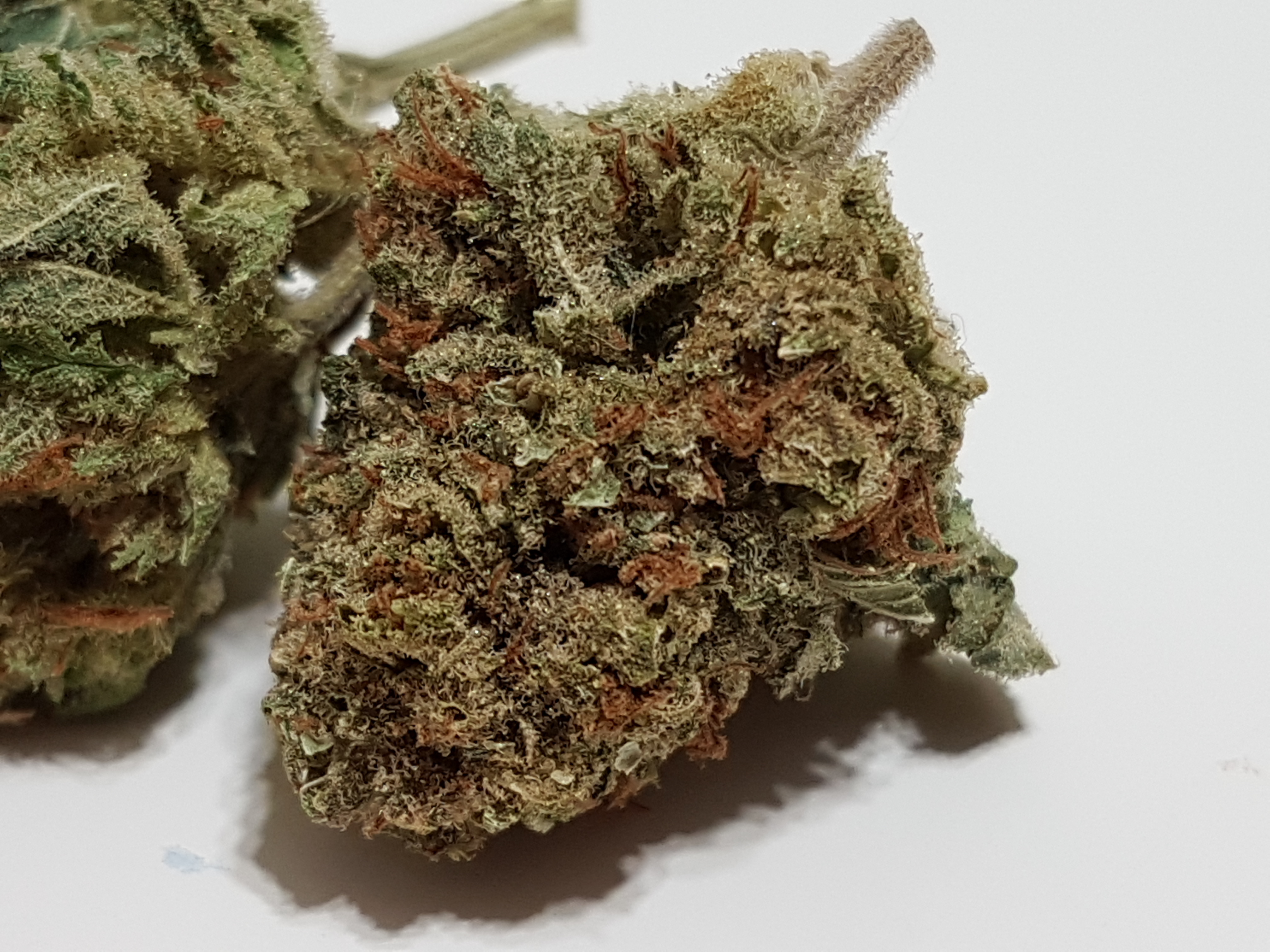 The appearance is a little bit leafy and under trimmed at first glance. Medium to light green in color accompanied by an abundance of smaller orange pistols and once you get past the extra leaves it has a nice covering of trichomes. Speaking of trichomes we have a nice array of trichomes from clear to milky to amber. Most of what i see through the scope is clear and milky with the odd amber trichome popping out.