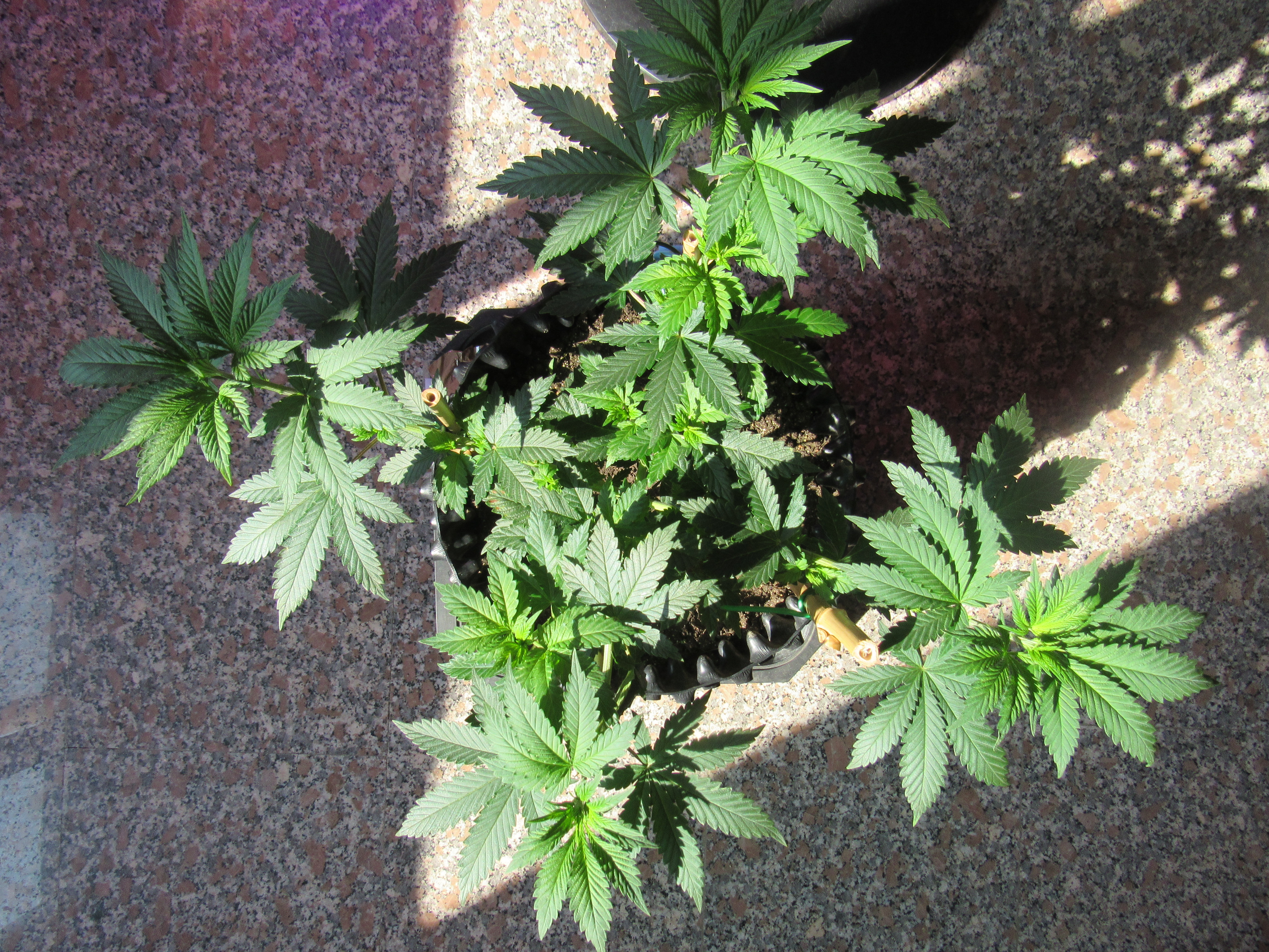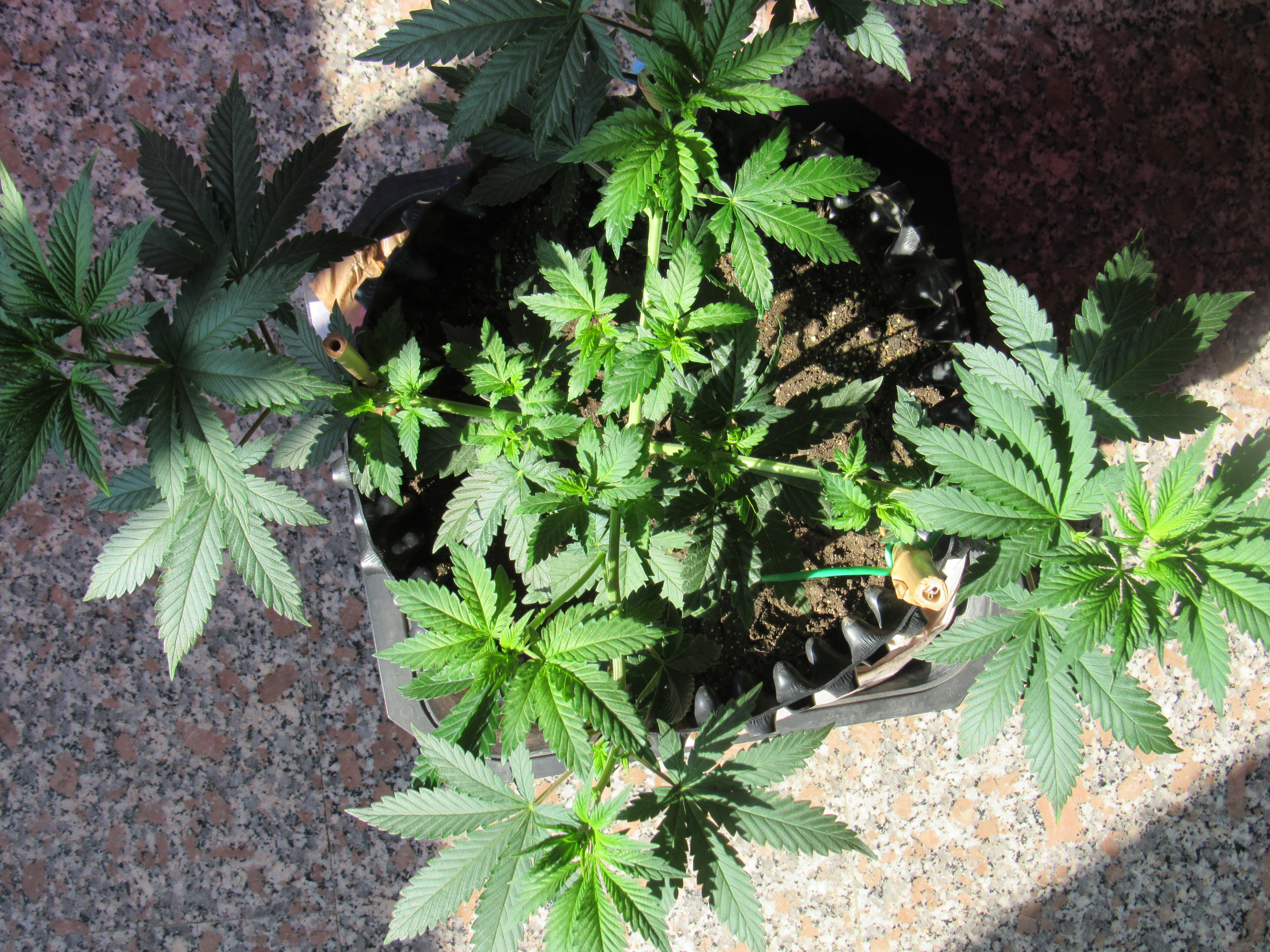 Two days ago I decided it was time to open her up a bit, so I took her out for LST, and pruned her in the middle to stimulate the growth of secondary bud sites. It worked quite well, and she's already growing new tops, that'll give me more yield in the end.