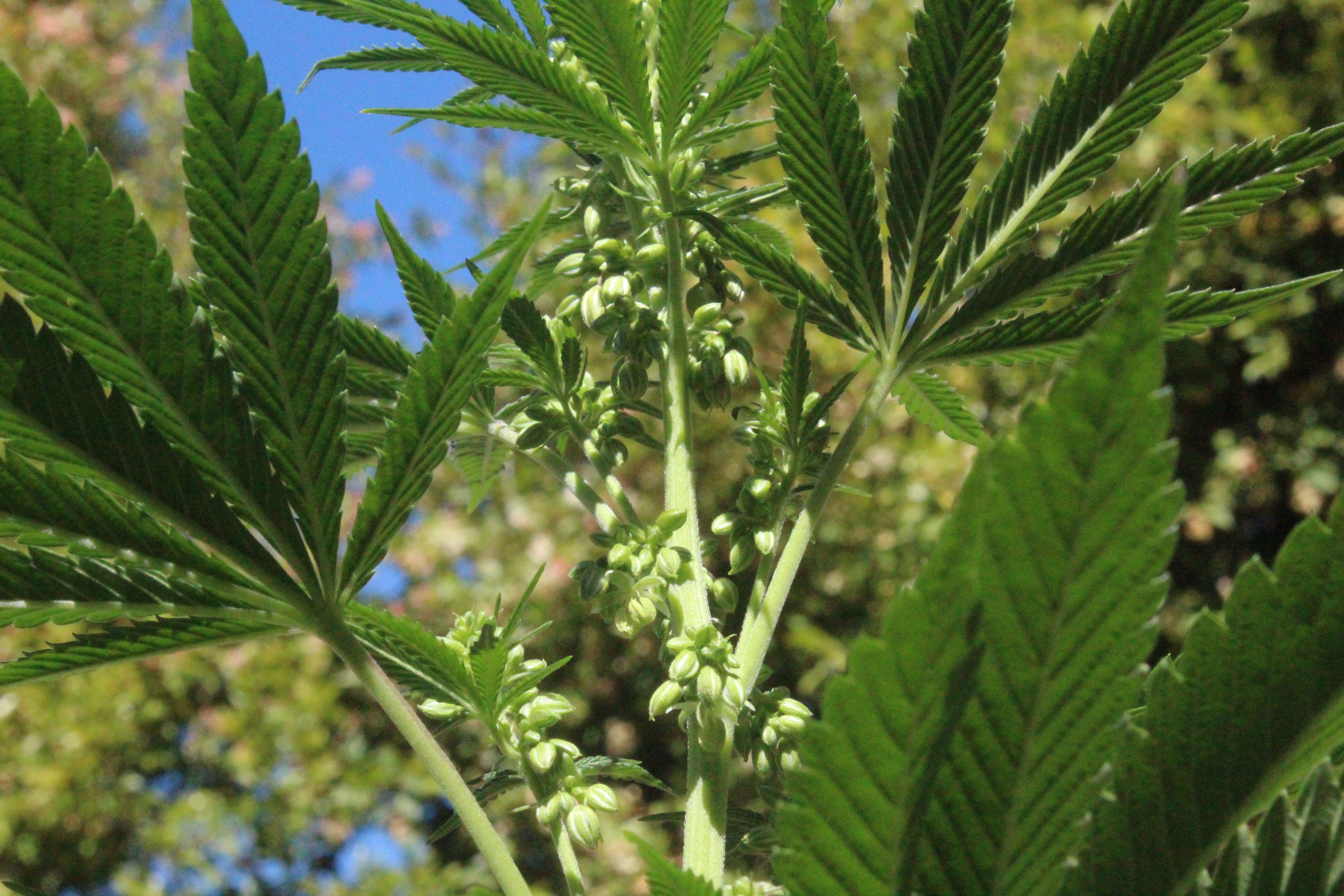 Starting to release some pollen; snapped a quick shot in case anyone was interested in what a male cannabis plant looked like. It is important, if you are growing for genetic purposes, to only choose the strongest males to pollinate the strongest females; "strong" meaning the plant displays the features you want to express in future generations. If you are growing purely for buds, be sure to get male plants as far away from your female plants (without killing them) as soon as they are identified. Plan ahead to avoid reckless waste of valuable cannabis plants!