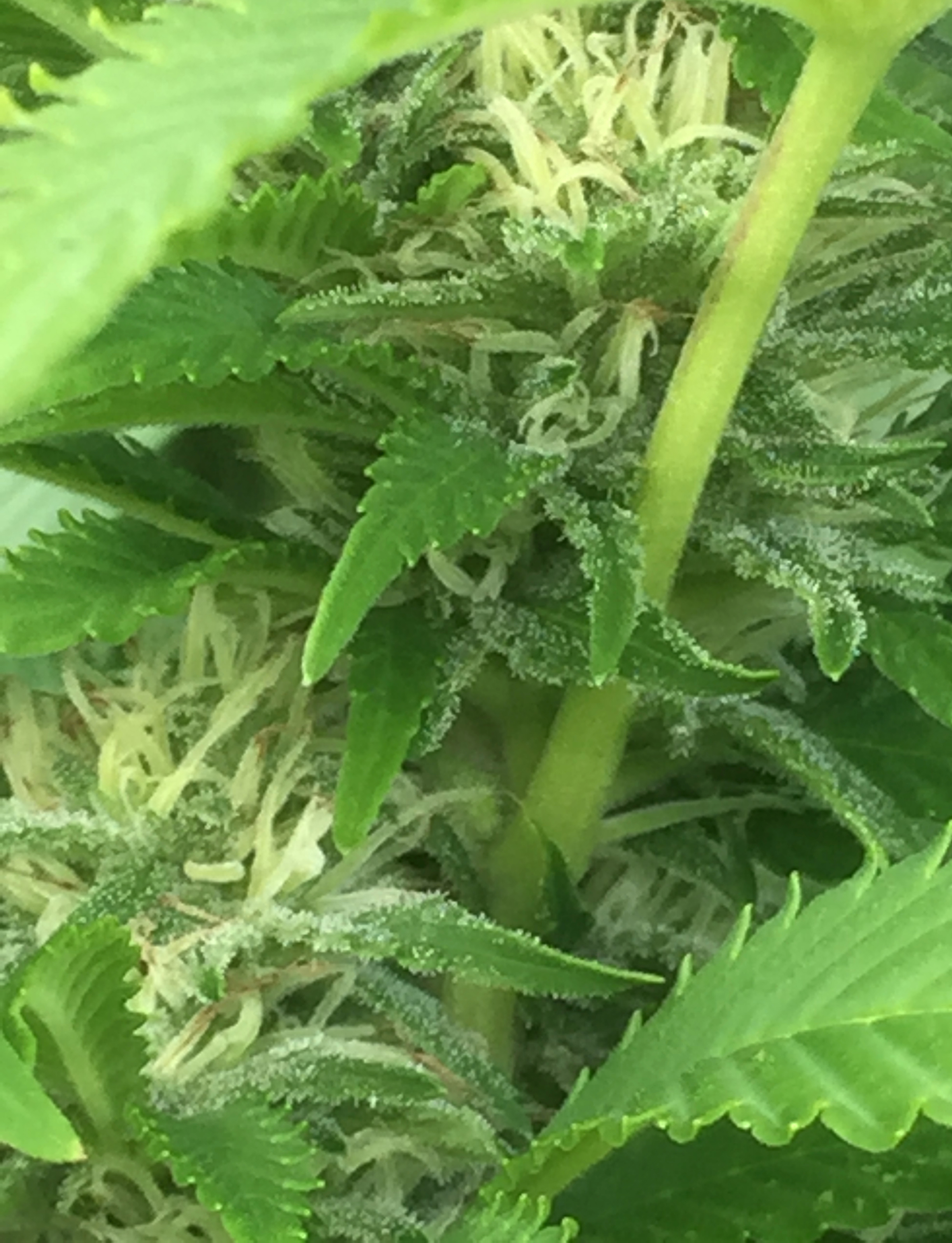 Cannabis plant is doing well after week 4 of flowering. Flowers are transforming to buds and getting first trichomes.