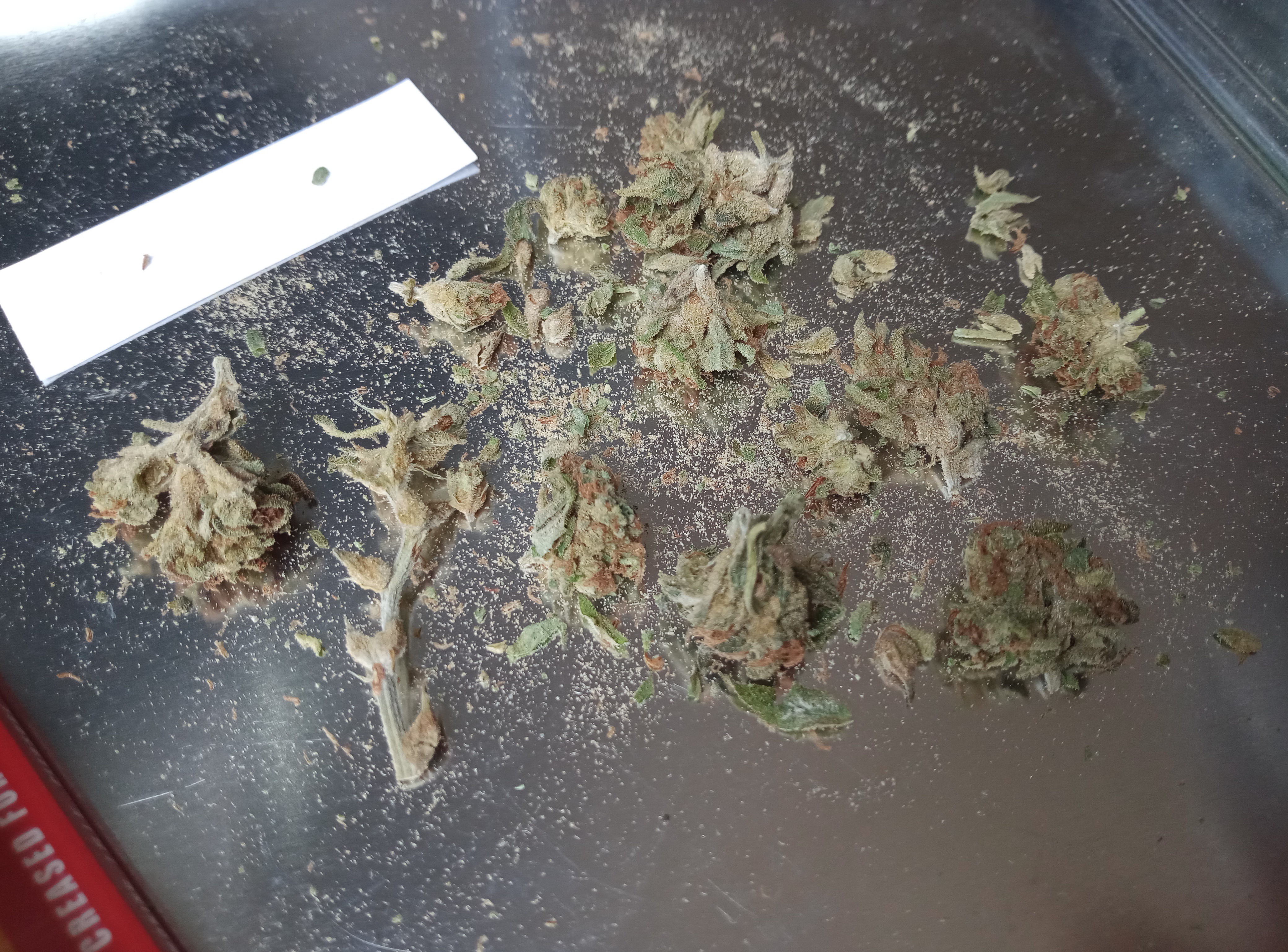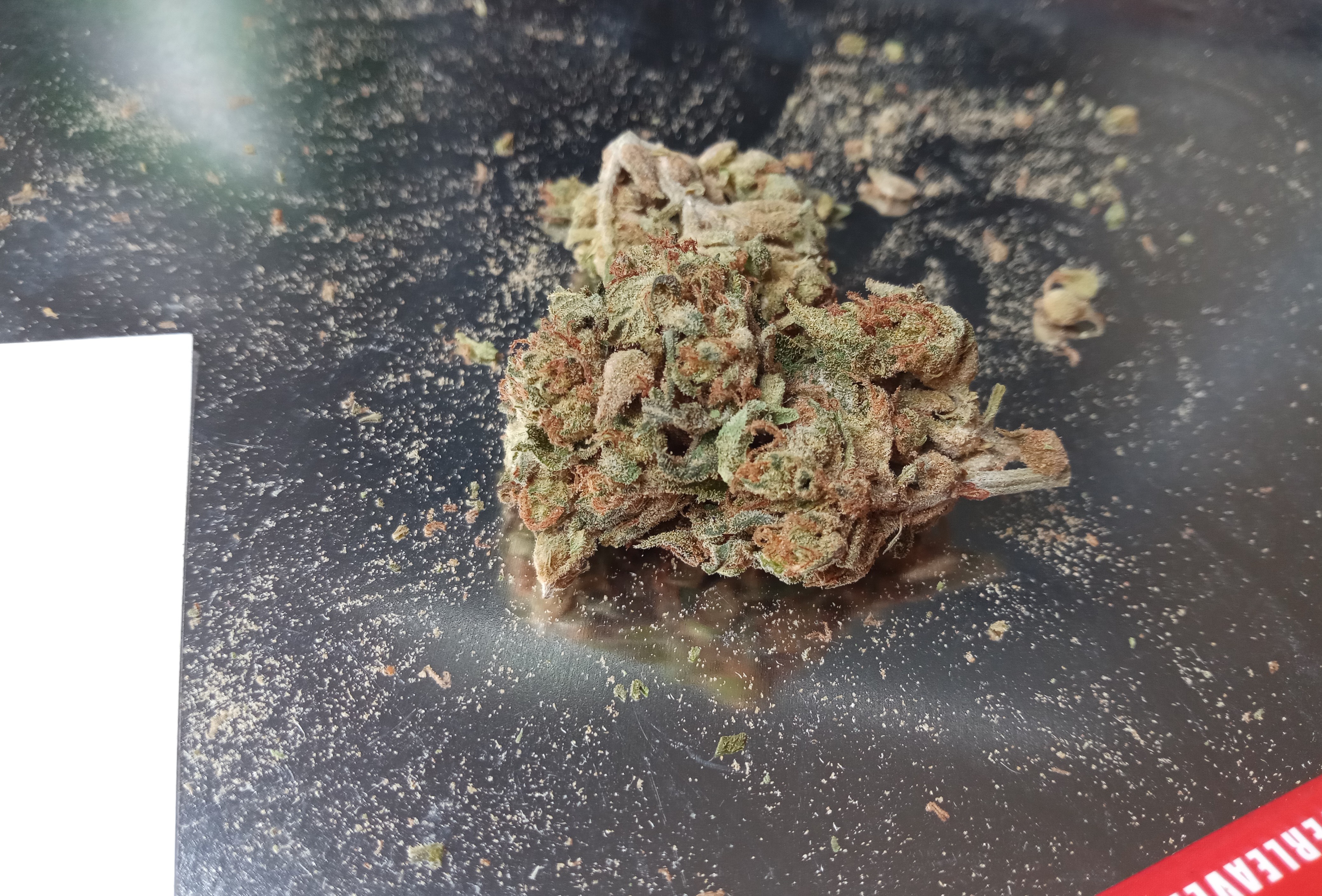 Of course the Trump OG bud has orange highlights and golden trichomes. They're crispy with lots of kief falling off on the tray. Skunky, fruity, and citrus aroma to them.