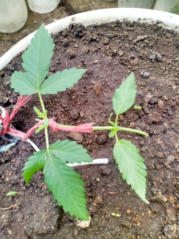 I stretch, I stretch and suddenly burst - the central stem broken exactly in half. Never mind I wrapped and pulled the string and we keep growing.