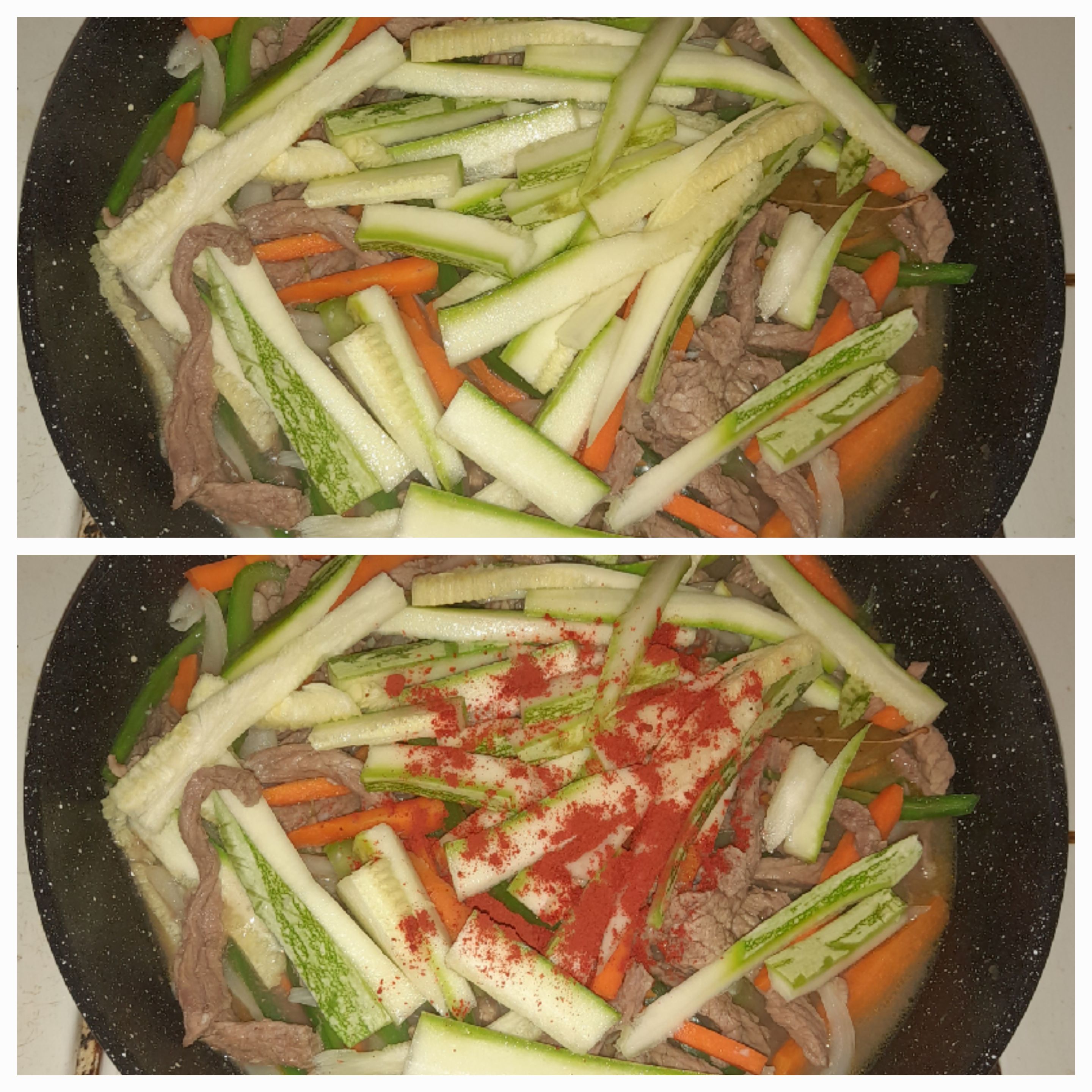 Después vamos a añadir la zanahoria, el pimentón y la cebolla a la carne que esta en cocción. Agregamos primero estos porque son un poco mas duros, dejamos de ultimo el calabacín. Cocinamos varios minutos y si esta muy seco puedes añadir un chorrito de agua.