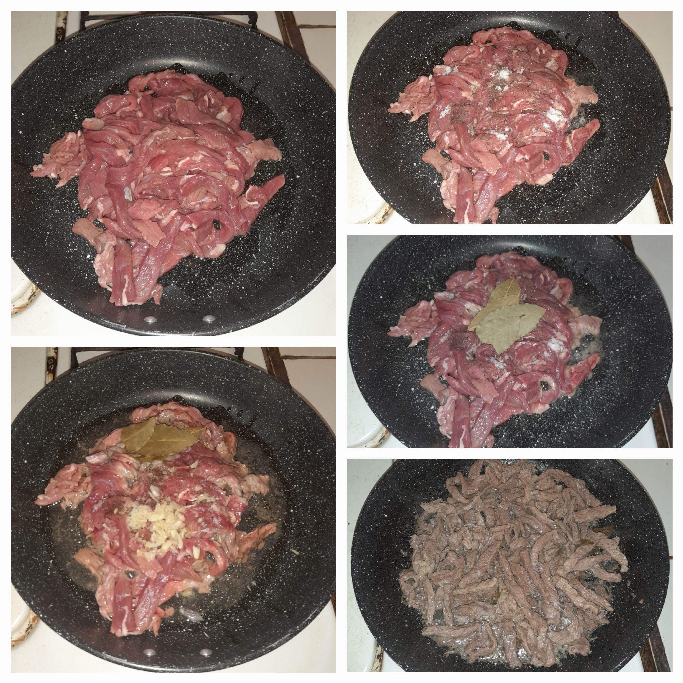 Luego vamos a colocar una sartén al fuego, añadimos un poco de aceite. Una vez caliente vamos a incorporar la carne, seguidamente la sal y pimienta, laurel, luego rallamos el ajo. Removemos y dejamos cocinar por unos minutos.