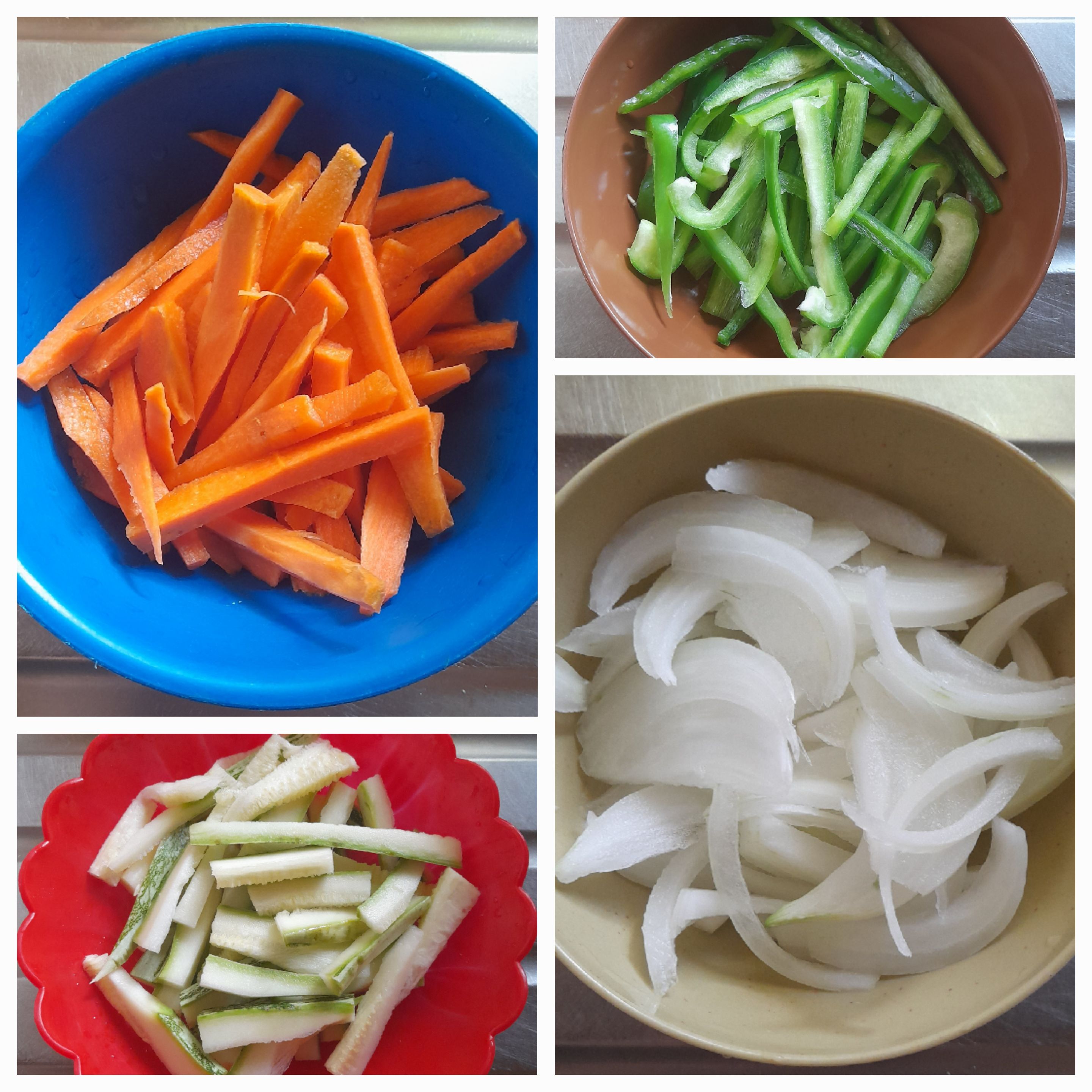 We are also going to cut the onion, paprika, zucchini and carrot into strips.