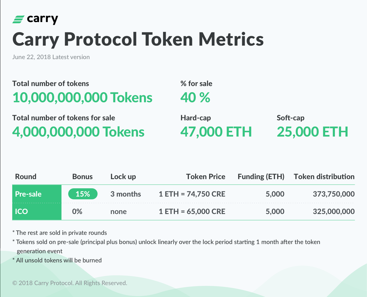 The systems runs on a dual token model. The main token is the CRE (pronounced as Carry), which can be use payment within the Carry ecosystem. It is also use by Merchant for accessing service in the Carry system like custom token generation or using smart contracts. Advertisers will reward CRE to consumers for sharing anonymous transaction data.