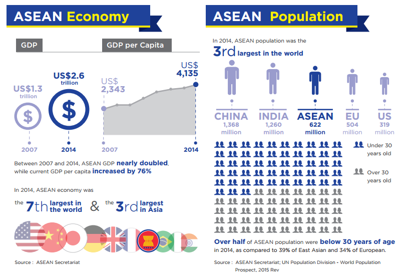The Association of South East Asia Nation (ASEAN) region has a very vibrant economy. In 2014, the region was the seventh-largest economic power in the world. It was also the third-largest economy in Asia, with a combined GDP of US$2.6 trillion – higher than in India. With 622 million people ASEAN is the world’s third largest market, which behind China and India has the third largest labour force.[1] The World Economic Forum predicted that by 2020, the region will have the world’s fifth largest economy [2]