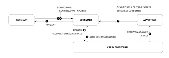 The carry protocol seeks to bring together consumer, merchants and advertisers. Carry protocol allow merchants to collect consumer data while allowing the consumer to be rewarded for spending and sharing their shopping data. Advertisers can also use the system to better market their product to focus consumer groups.