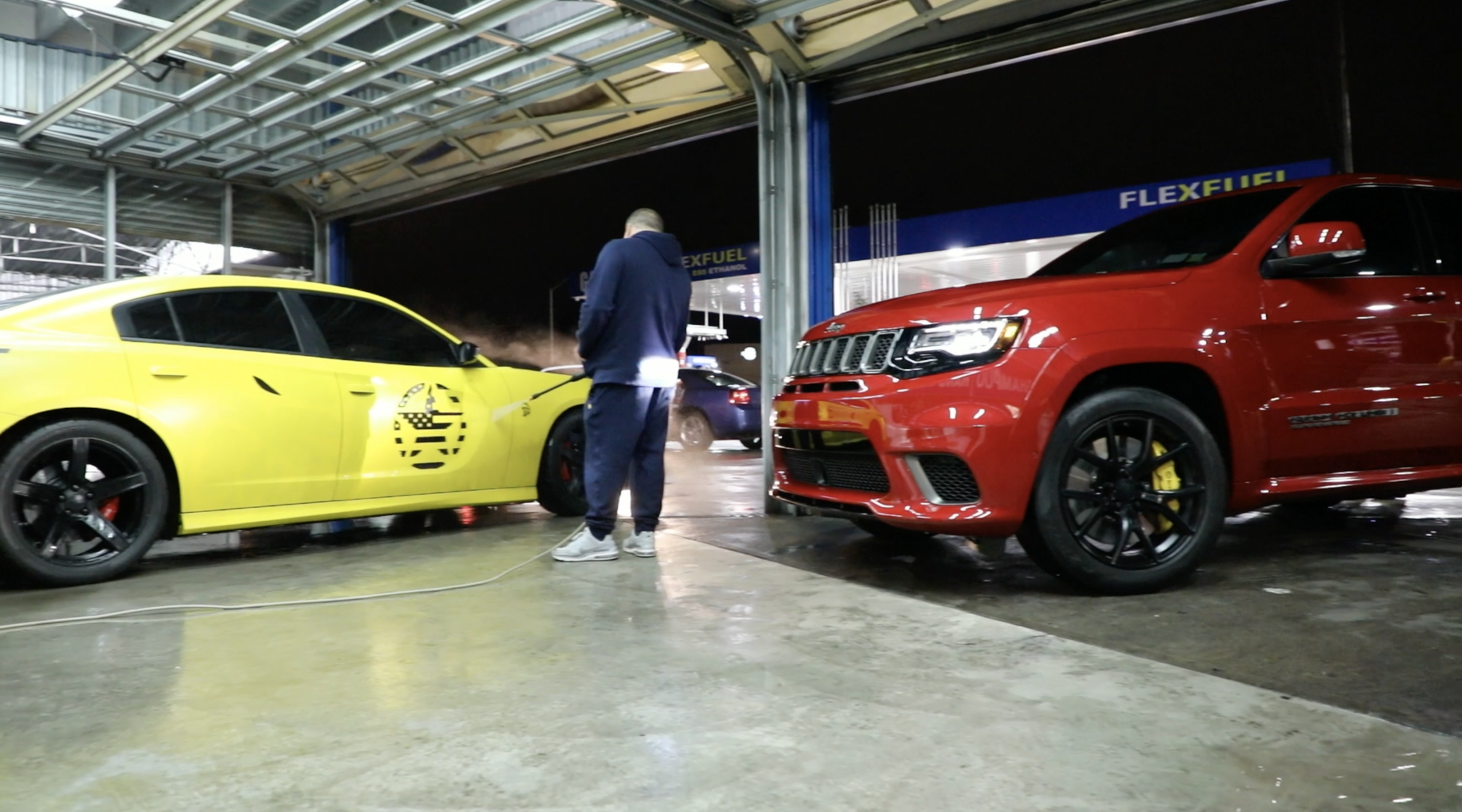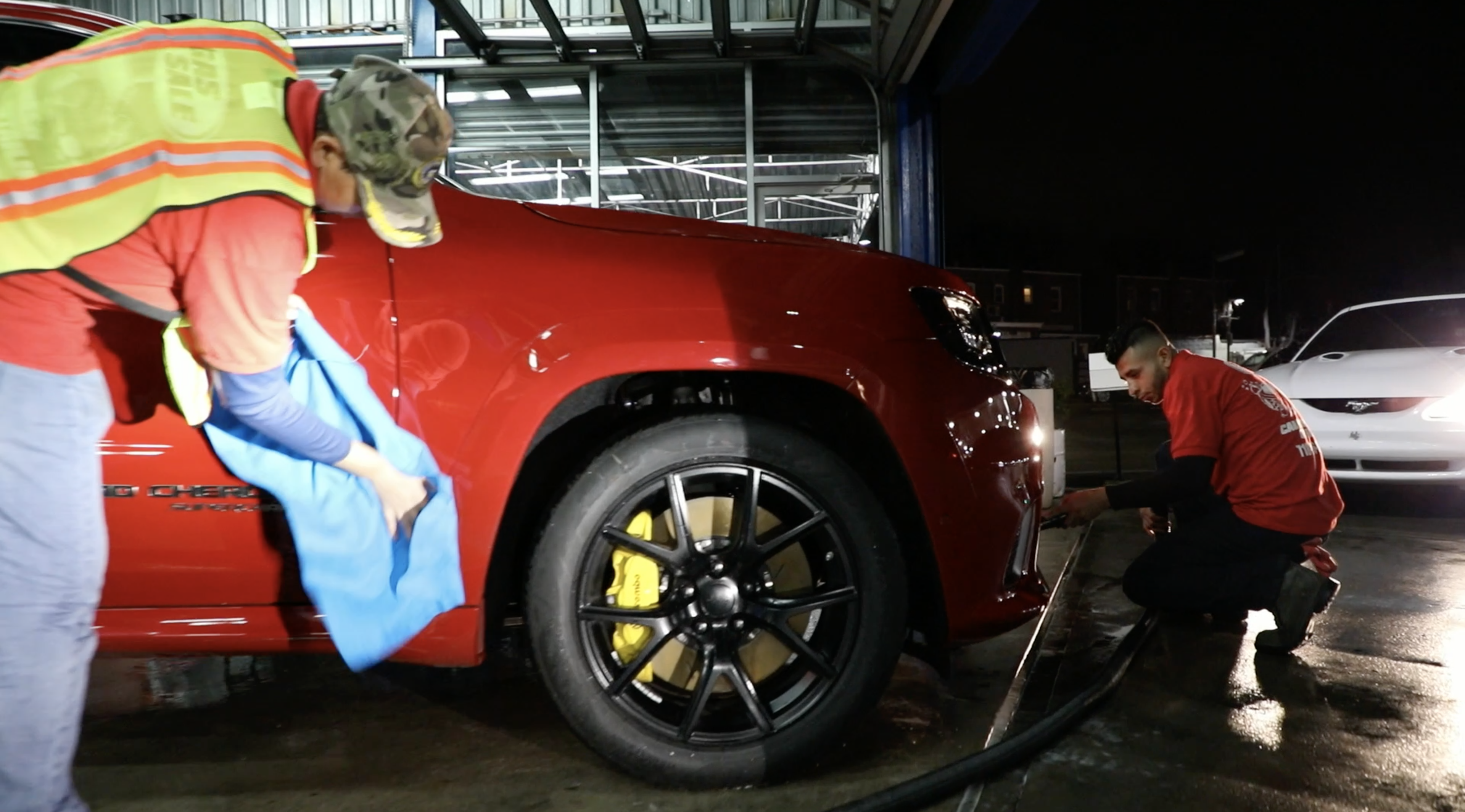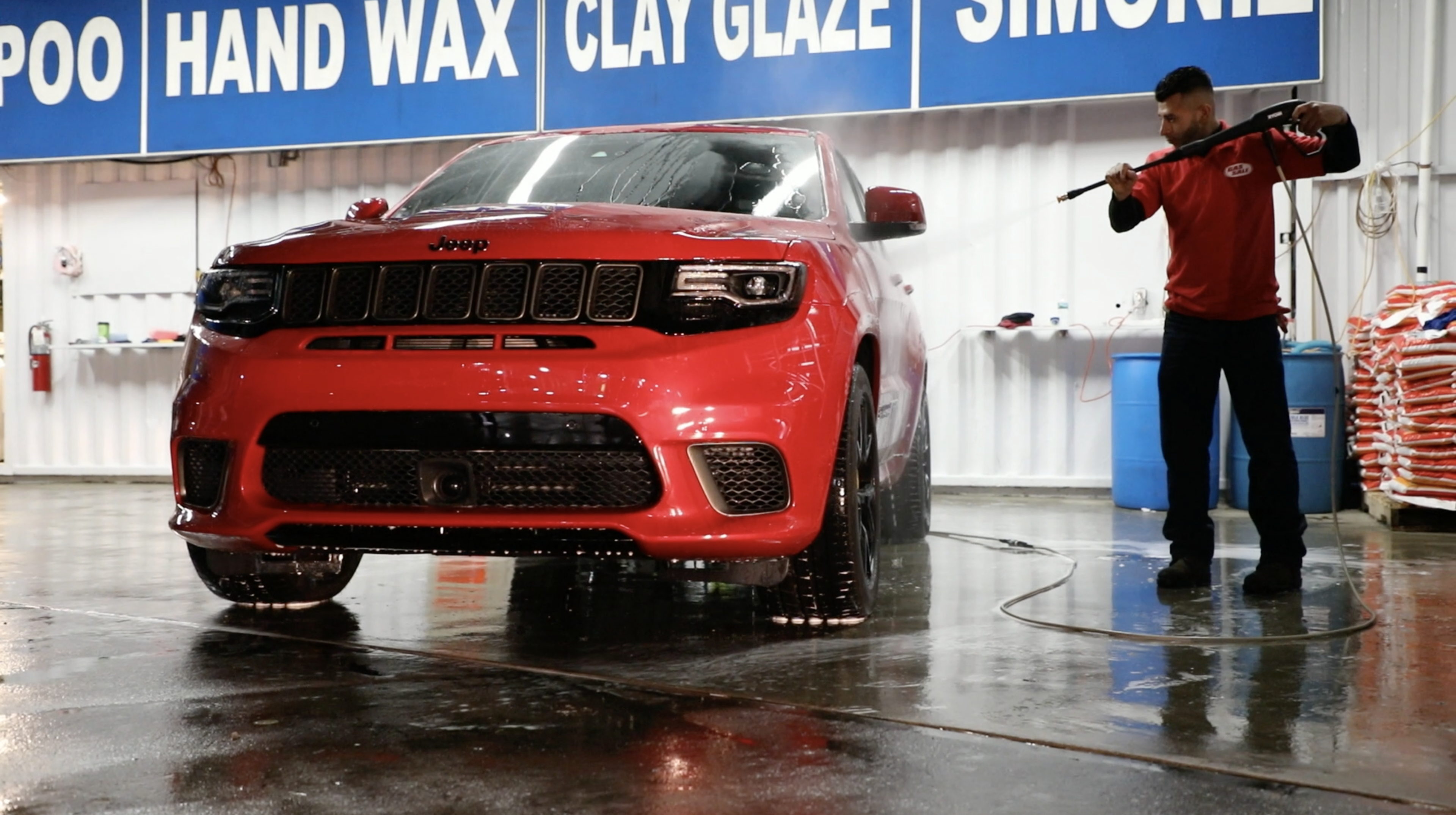 I was impressed to see how much time they spent on the different processes. First, they shot this water cannon and washed off any kind of dirt, mud or junk. Next, they spray foamed it with the same style gun only this time it was projecting a thick foam onto the body of the car. After letting it sit for a few mins, a few guys jumped right on top of that soap and began to wipe it down with a sponge and a furry glove that looked like a wet cat. In less than an hour, it was time to wash down this dripping wet Trackhawk.