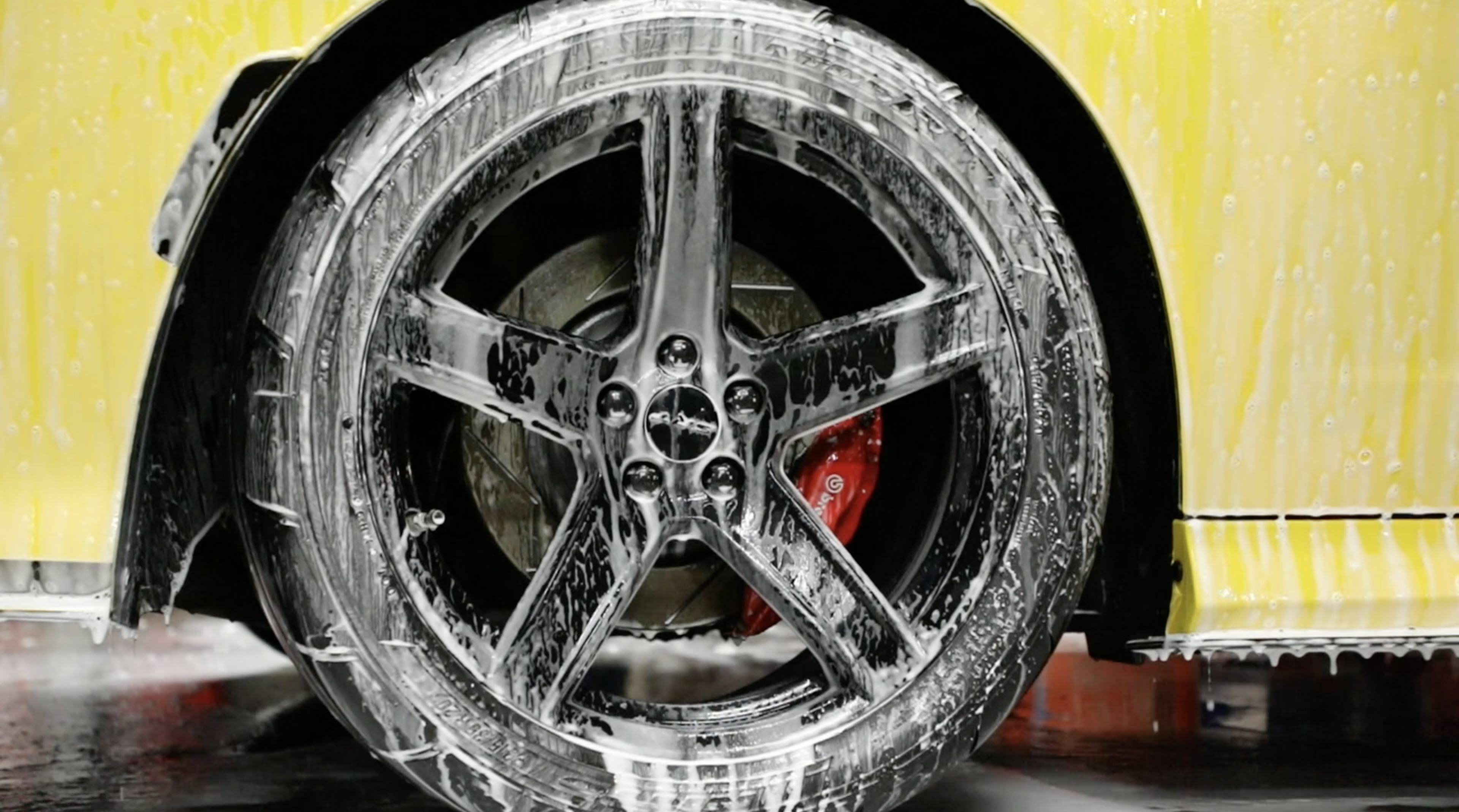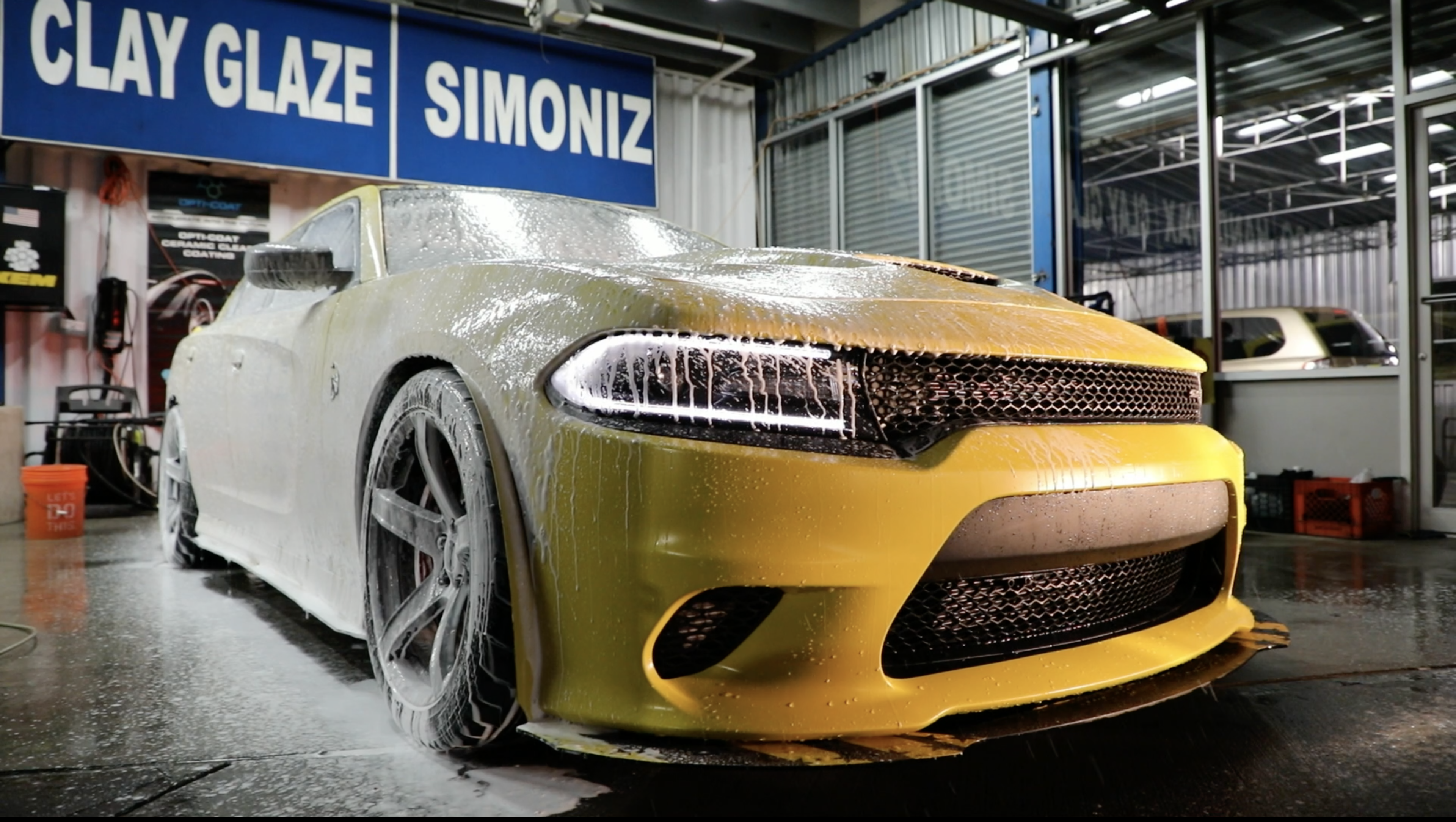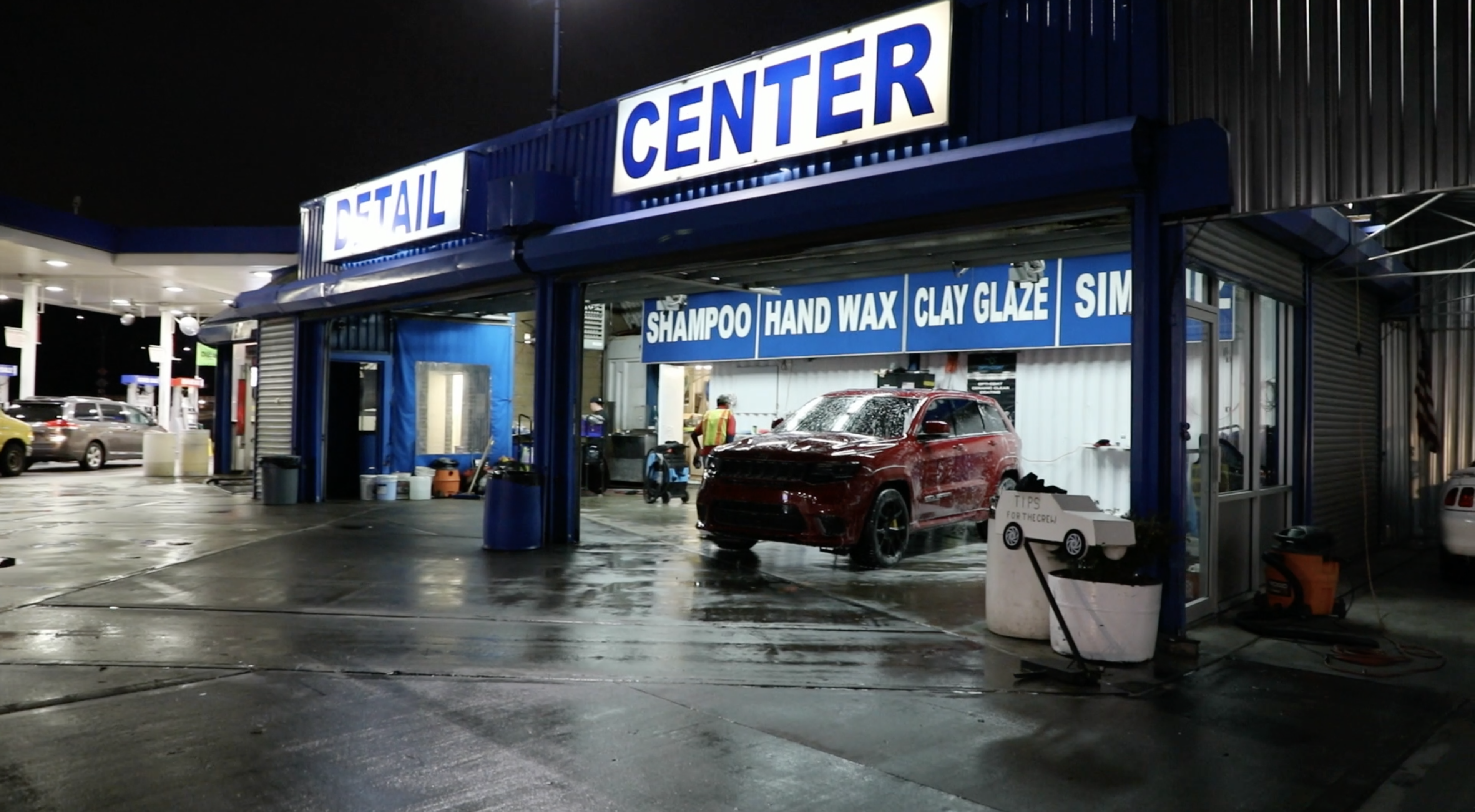 I was impressed to see how much time they spent on the different processes. First, they shot this water cannon and washed off any kind of dirt, mud or junk. Next, they spray foamed it with the same style gun only this time it was projecting a thick foam onto the body of the car. After letting it sit for a few mins, a few guys jumped right on top of that soap and began to wipe it down with a sponge and a furry glove that looked like a wet cat. In less than an hour, it was time to wash down this dripping wet Trackhawk.