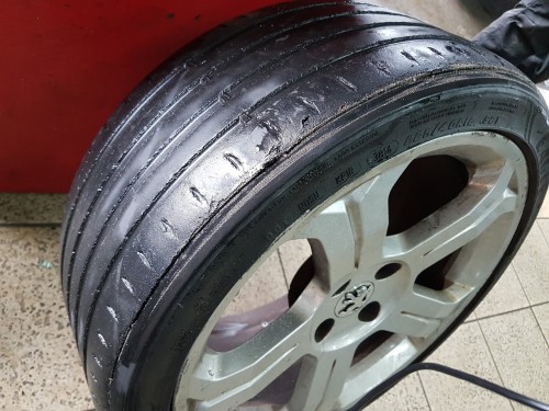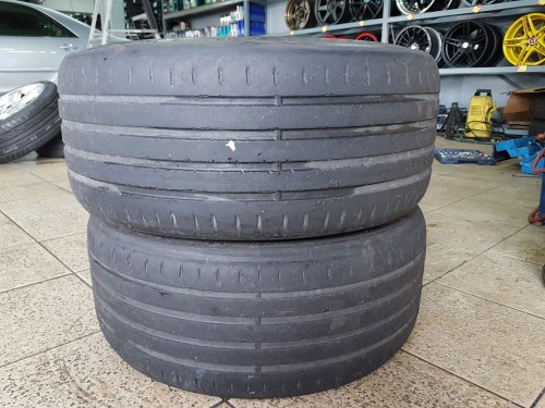 The tyres on this car was in a really bad shape already since it has been a few years since it was changed. Wanted to change a set of 4 tyres but due to stock availability, only a pair can be changed. The car used to run on Ultra High Performance tyres which is Goodyear Eagle F1 Assymetric 2 but I figured out that since the car spends most of its lifetime in the workshop and service centre rather than being on the road, I can make a compromise to use cheaper but still a very good set of tyres. Here's how the current set of tyres looks like, its very bad in the rain as you can probably tell
