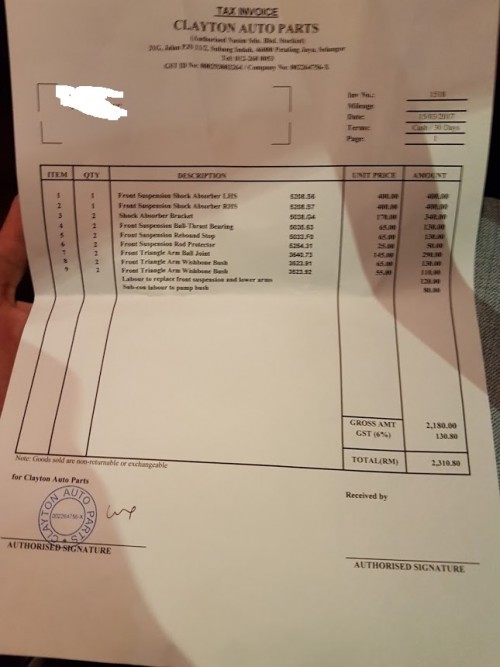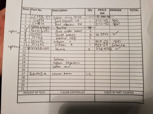 Once the car is ready for collection, I was given a quotation list on what parts that needed to be changed as per highlighted to them during the service, which is the suspension items and the OBD connector. The OBD connector fault was due to the main wiring harness being shot, thus requiring a change which will cost RM 13,700. So I said no, just leave it as it is. Nevermind the check engine light