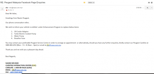 Early this year (around January), the car had done its 100,000KM regular service interval. Apart from that, few complaints was highlighted. Also, Peugeot is having a recall on all their model to replace certain components in the car, for my unit, it was these parts that was in need of replacement.