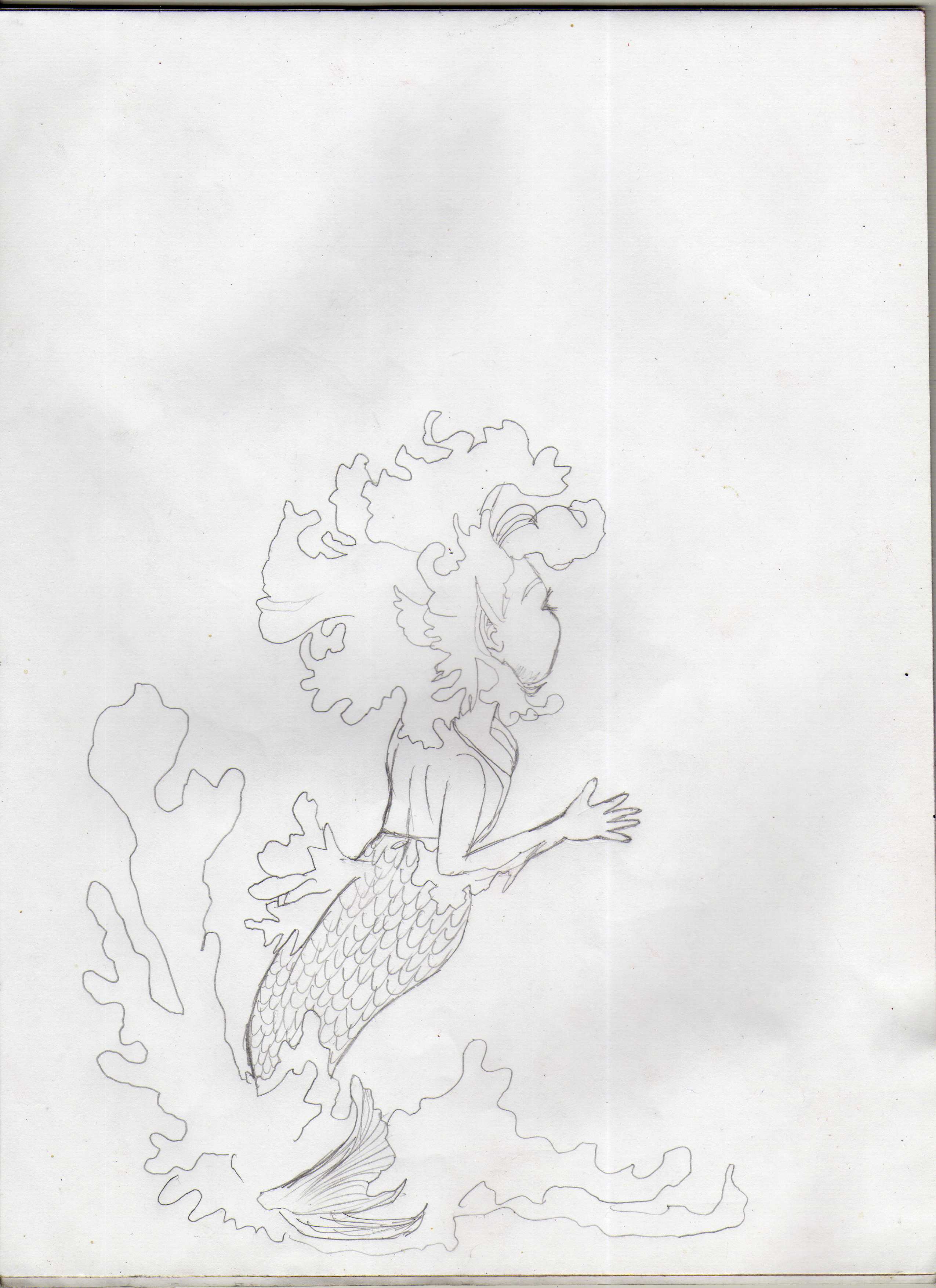 El primer paso es dibujar a la chica sirena, también dibujo las olas.