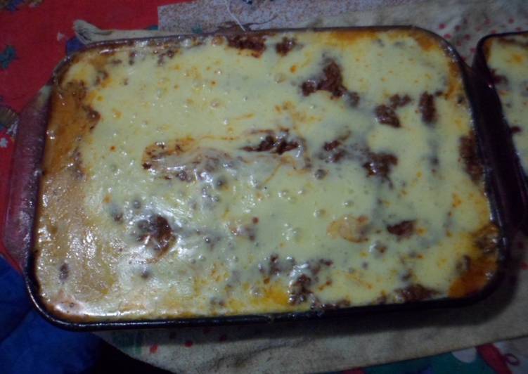 De nuevo bechamel, luego queso gouda y otra capa de cachapas y así se va armando las capas, hasta terminar con los quesos gratinados encima.