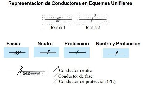 El número de conductores del circuito se representa por un número o por trazos oblicuos a 45º sobre la línea que representa el circuito, un trazo por cada conductor. El conductos neutro también puede ir representado en los esquemas unifilares con una línea de trazo discontinuo paralela a los conductores que representan los conductores activos (fases)