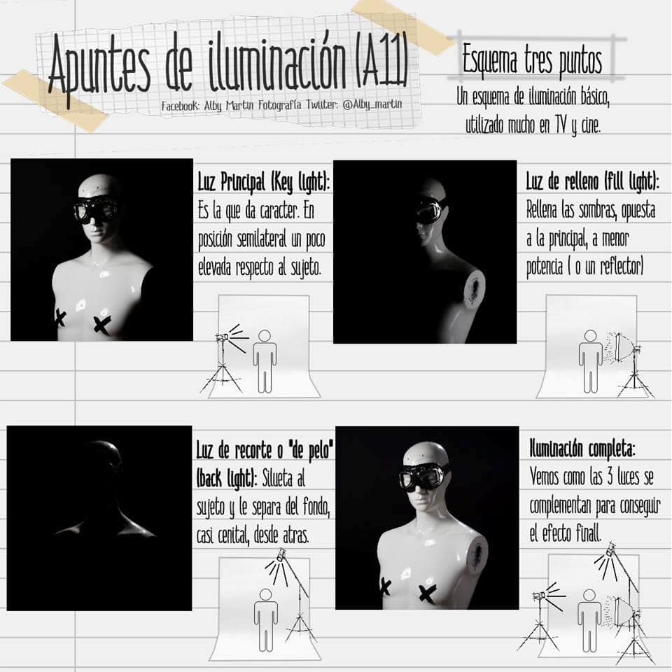 Después de entender los colores y las temperaturas en la iluminación fotográfica podemos hablar un poco sobre los tipos de luces esenciales para que una fotografía sea "correctamente" iluminada. Estos tipos de luces, podemos modificarlos y posicionarlos a nuestro gusto intensificando o suavizando el impacto en el sujeto/objeto que fotografiemos. Veamos cuales son: