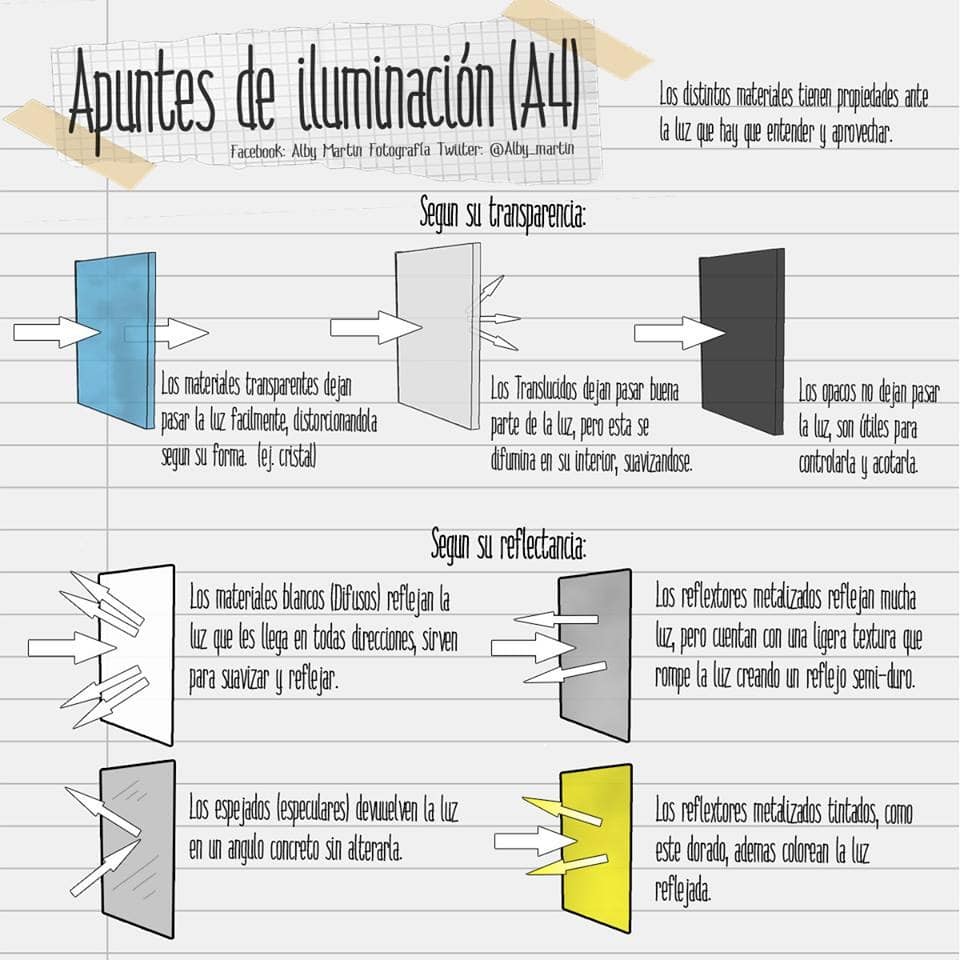Y por último pero no menos importante, esta imagen nos explica los distintos materiales que tienen propiedades ante la luz. Pueden estar a nuestro alcance, y nos despierta la curiosidad explorando los distintos tipos de materiales para volverlos nuestros aliados en las fotos. ¿No crees?