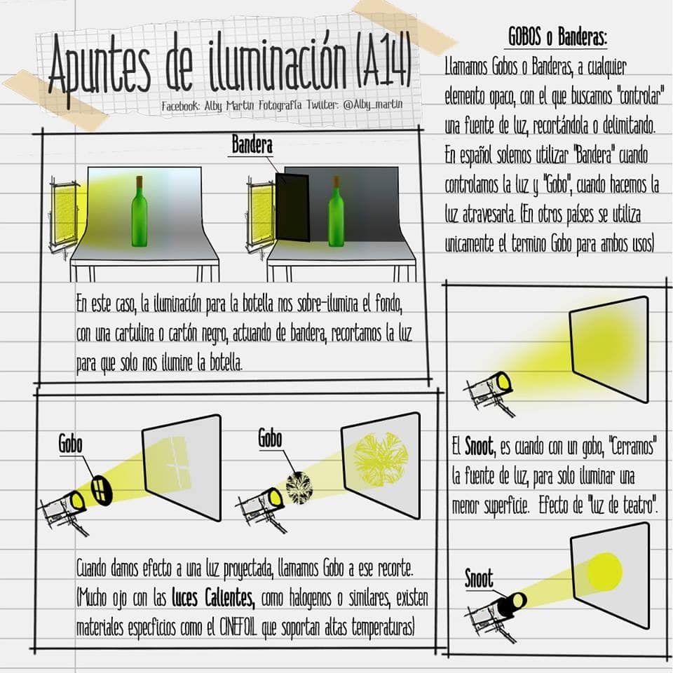 La bandera, muy útil para direccionar la luz y limita su difusión hacia una dirección en específico. Se puede utilizar uno o varios dependiendo de qué tan estrictos deseamos ser con la luz. Podemos utilizar como bandera un material firme como una cartulina negra, por ejemplo.