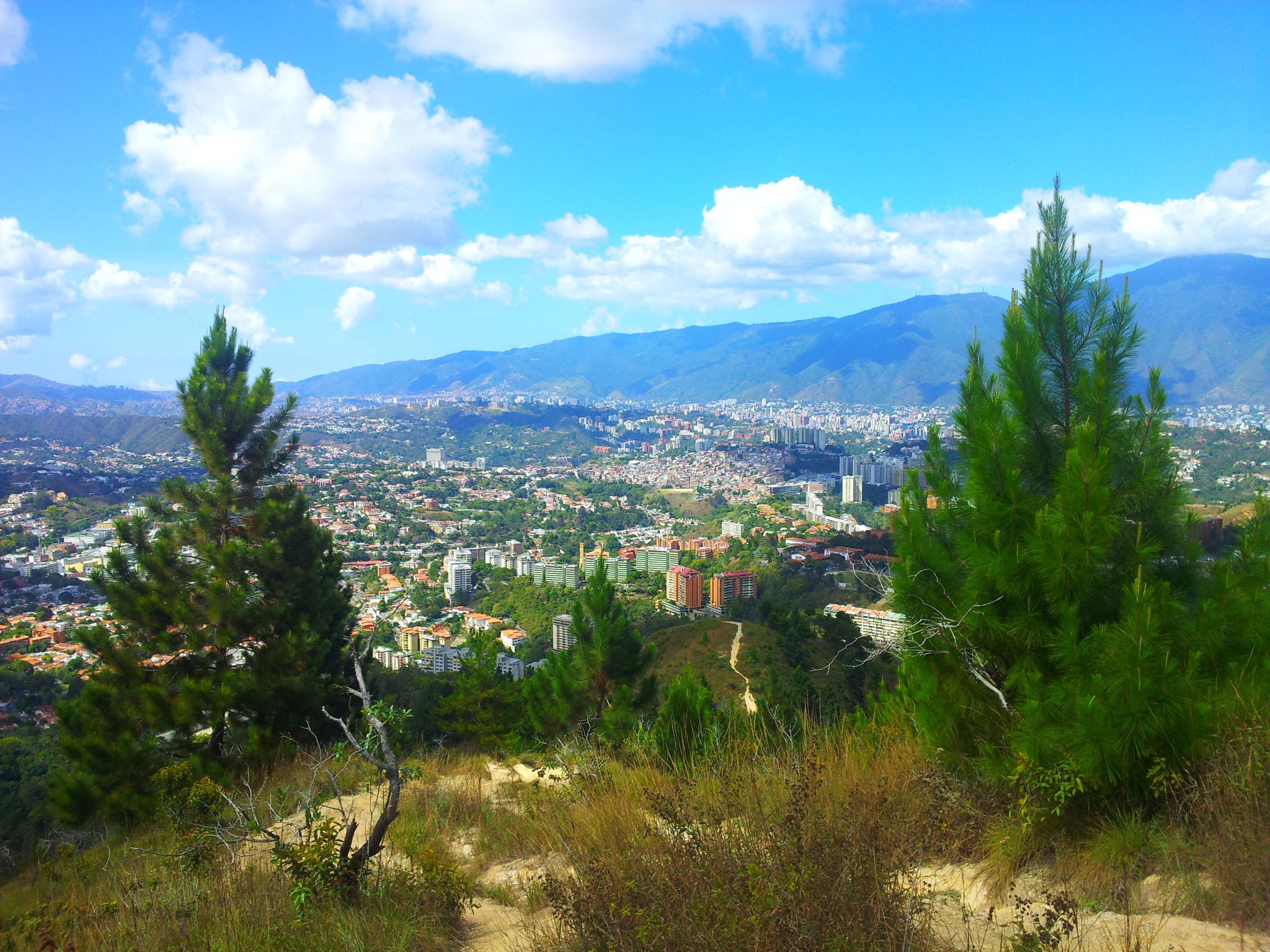 Superado el bosque de pinos, el camino se abre para dar paso a un terreno amplio con una vista espectacular hacia la ciudad y además se puede apreciar hacia el norte el Cerro El Ávila.