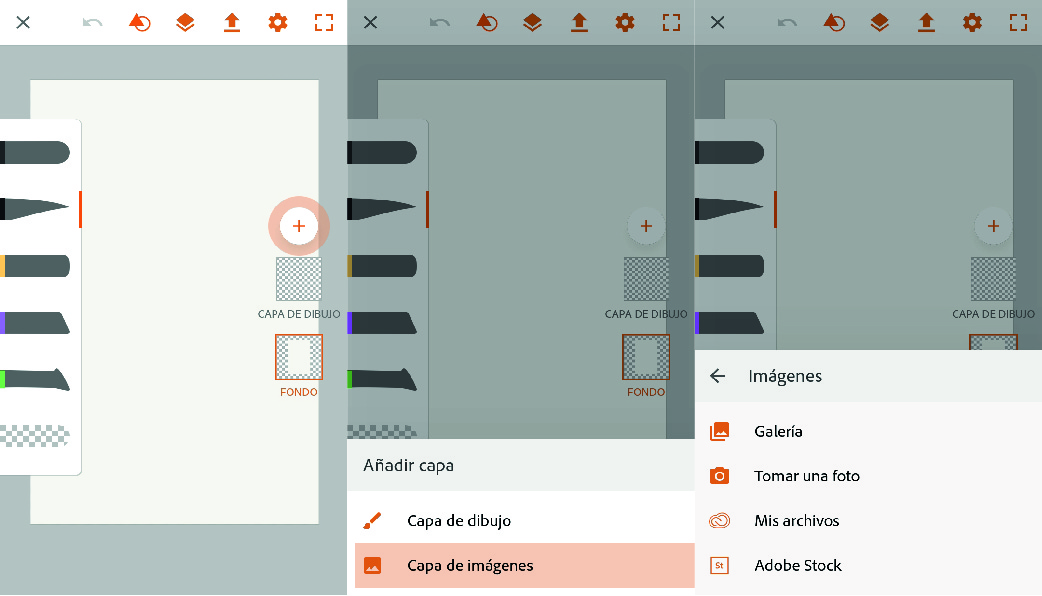 Al tener abierta nuestra mesa de trabajo, procedemos a seleccionar la imagen a seguir para dibujar. Hacemos click en "capas", "+" y "capa de imágenes", y elegimos la fuente de la imagen que vamos a ilustrar.