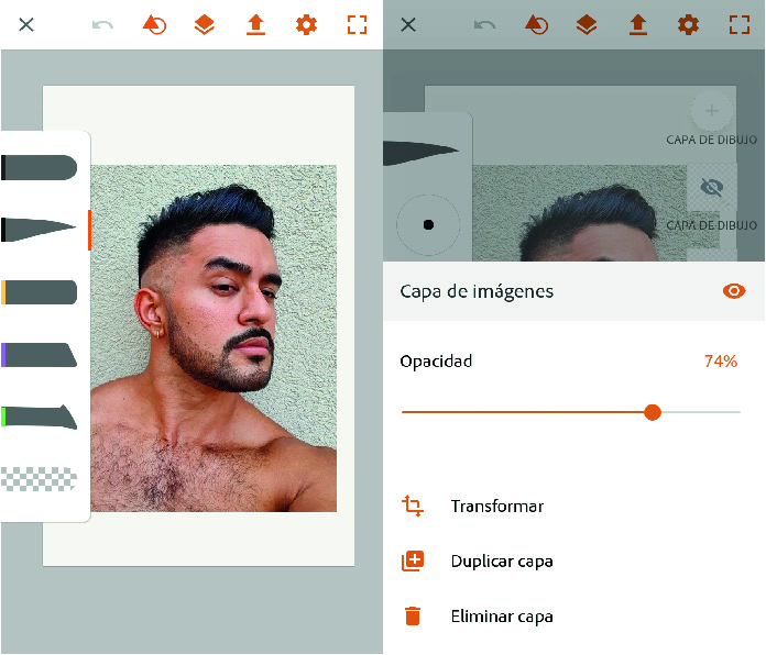 Una vez elegida la imagen, vamos a seleccionar la capa donde está ubicada, bajar un poco la opacidad para poder dibujar encima de ella y que se noten nuestros trazos.