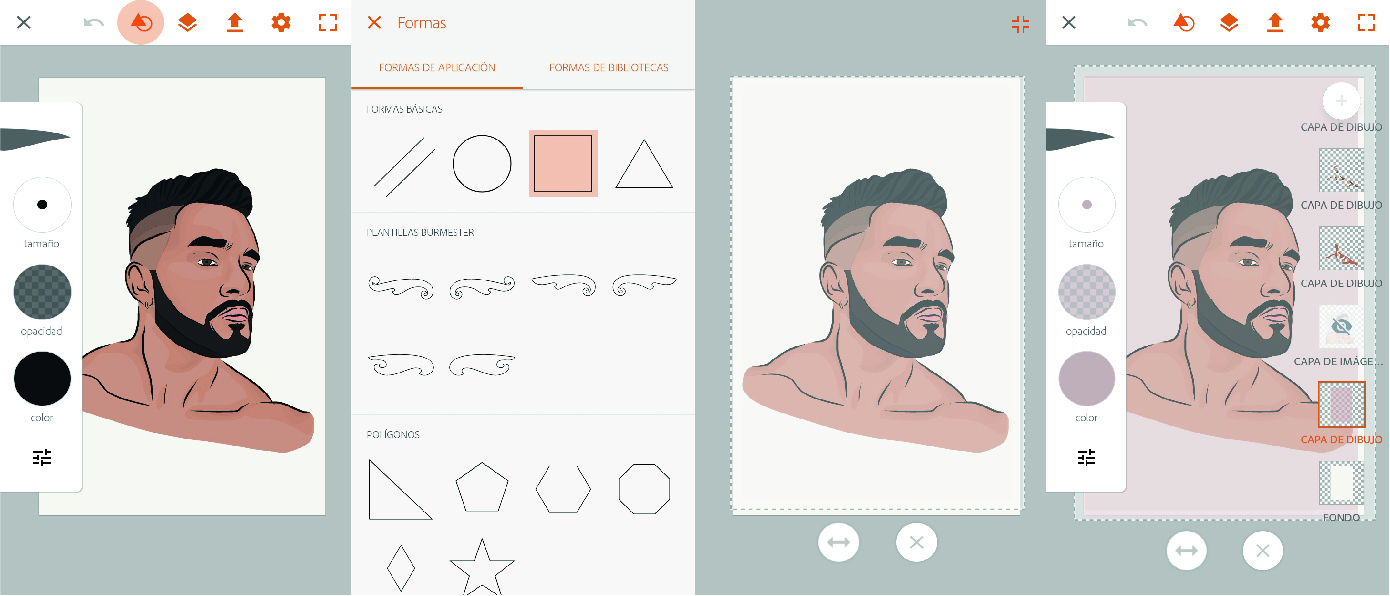 En una capa debajo de todas, nos dirigimos a la sección de formas, hacemos click sobre el cuadrado y con las flechas podemos regular sus dimensiones. Seleccionamos un color (el cual recomiendo sea claro y bajarle un poco la opacidad para que no distorsione la tonalidad de la piel) y dejamos presionado dentro del cuadrado y esto hará que se rellene totalmente.