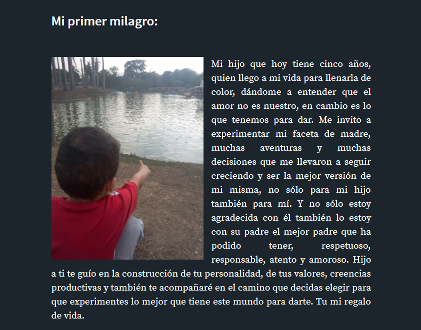 Mi hijo que hoy tiene cinco años, quien llego a mi vida para llenarla de color, dándome a entender que el amor no es nuestro, en cambio es lo que tenemos para dar. Me invito a experimentar mi faceta de madre, muchas aventuras y muchas decisiones que me llevaron a seguir creciendo y ser la mejor versión de mi misma, no sólo para mi hijo también para mí. Y no sólo estoy agradecida con él también lo estoy con su padre el mejor padre que ha podido tener, respetuoso, responsable, atento y amoroso. Hijo a ti te guío en la construcción de tu personalidad, de tus valores, creencias productivas y también te acompañaré en el camino que decidas elegir para que experimentes lo mejor que tiene este mundo para darte. Tu mi regalo de vida.