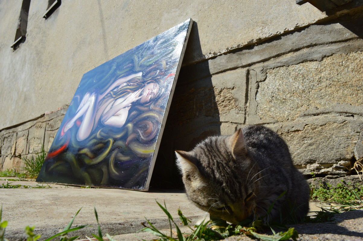 You are now probably wondering what she did to deserve that complimentary name. No, she didn't make that painting in the photo. My sister is the author. Omiljena maca likes posing with my sister's paintings. But we can't blame her, who wouldn't like to do that, my sister is really talented.